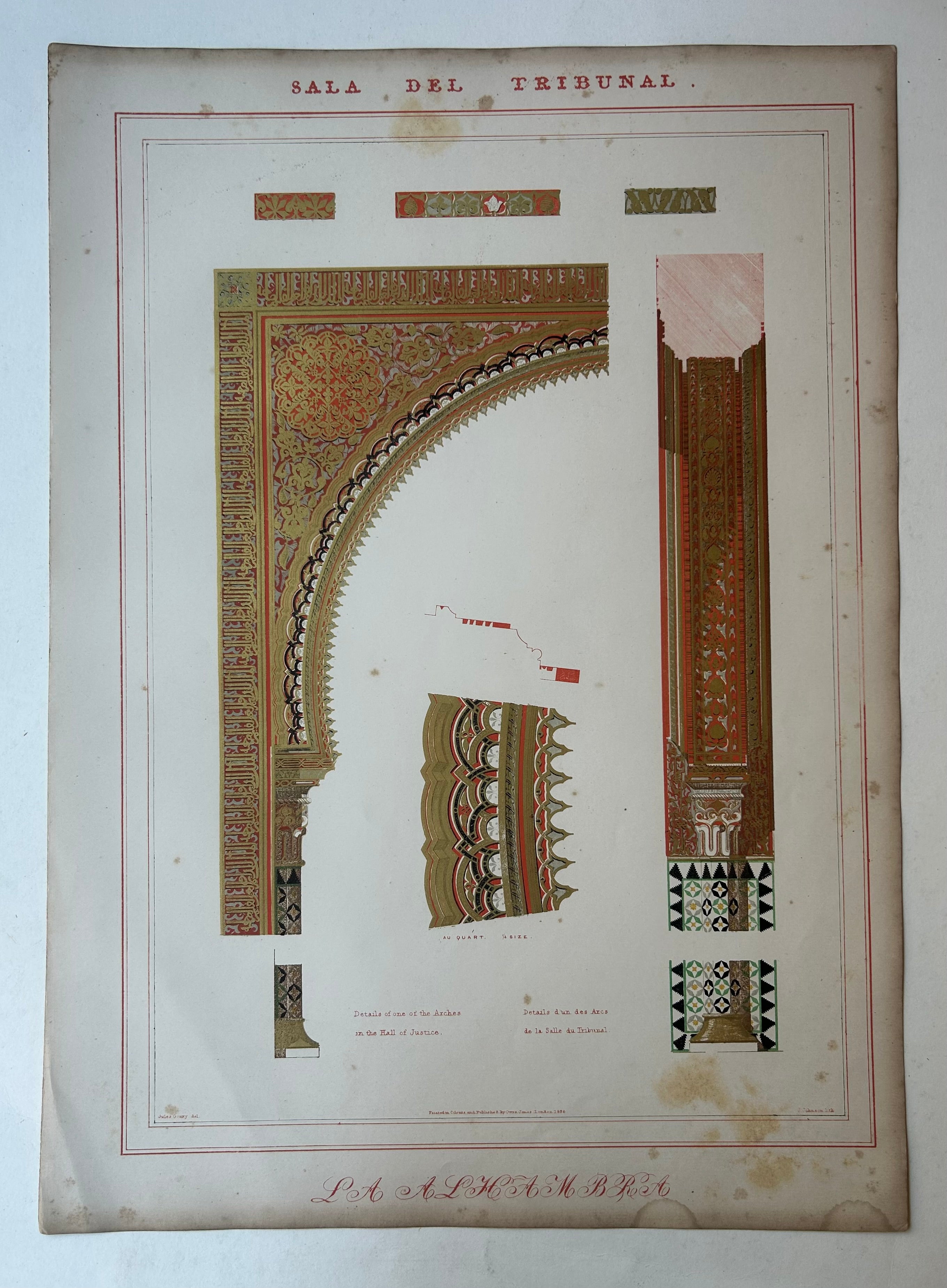 This print comes from a compilation of plans, elevations, sections and details or the famous Alhambra. The Alhambra is a feat of Islamic architecture, a palace in Grenada, Spain. This book was created from the drawings of architects Jules Goury and Owen Jones. Jones was known for his eye for design and is often attributed with being a pioneer of modern color theory. His attention to detail is recognized in his works in this compilation. The works of Goury included in this compilation were drawings done on site at the Alhambra in 1834.