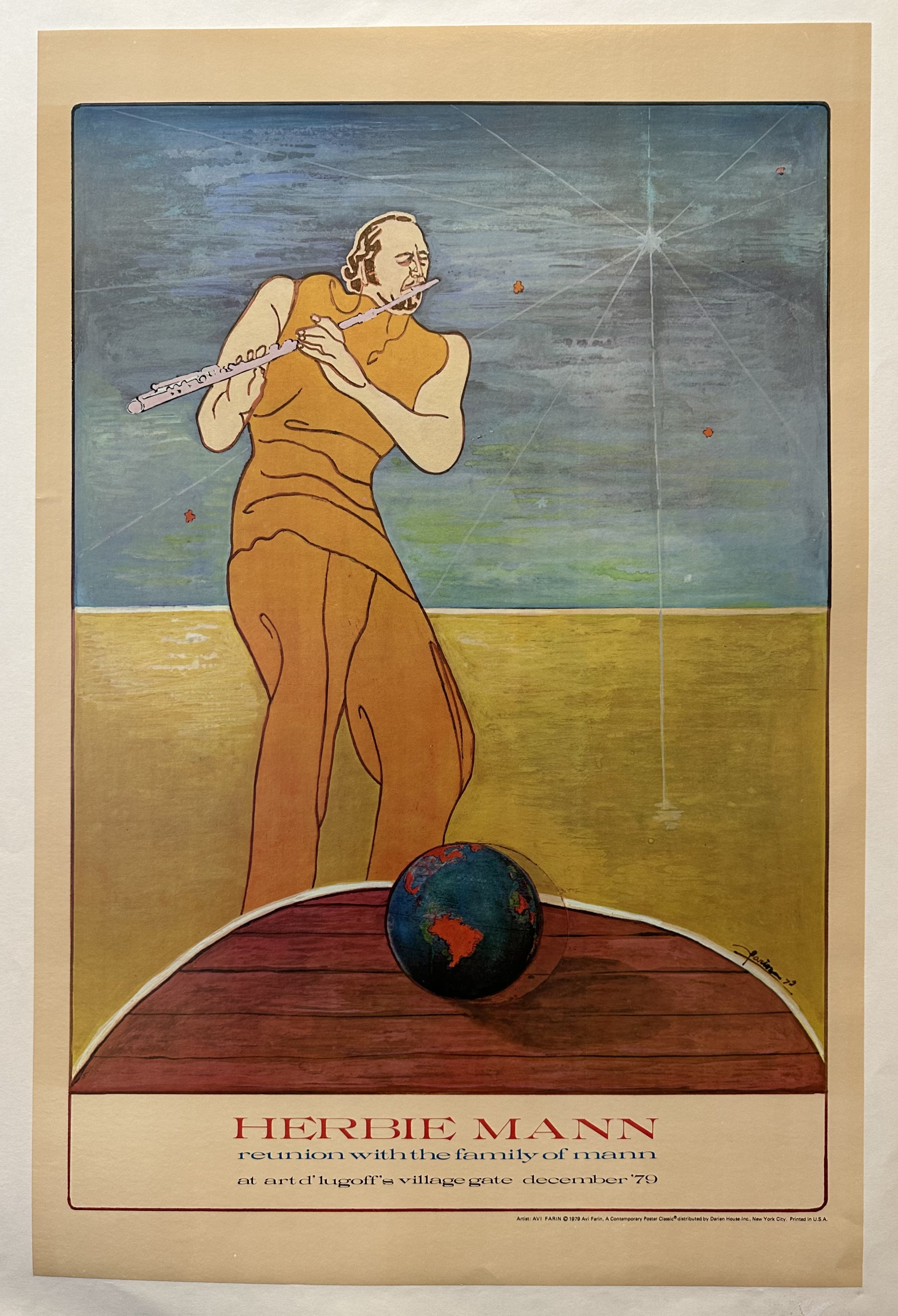 This was made by Avi Farin for Art D'Lugoff's jazz club in New York City's Greenwich village. It displays a man placed in front of a sky backdrop with a leading star beside him. This is Herbie Mann, his talent had always put Farin in a mystical mood.