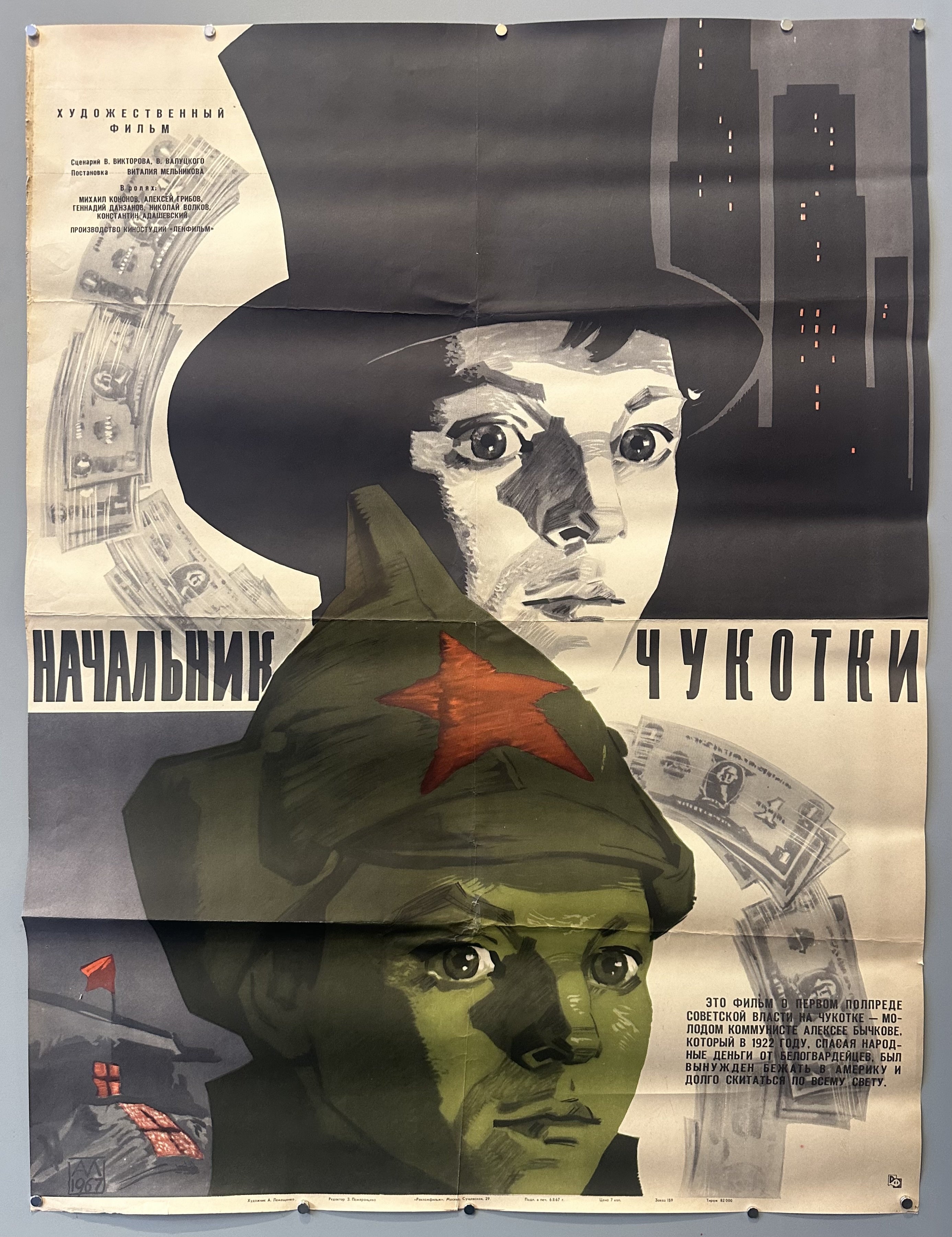 English translation: "FEATURE FILM / Screenplay by V. VIKTOROV. V. VALUTSKY / Directed by VITALY MELNIKOV / Starring: MIKHAIL KONONOV, ALEXEY GRIBOV. GENNADY DANZANOV, NIKOLAY VOLKOV KONSTANTIN ADASHEVSKY / CHIEF OF CHUKOTKA / THIS IS A FILM ABOUT THE FIRST PLENIPOTENTIARY OF THE SOVIET POWER IN CHUKOTKA - YOUNG COMMUNIST ALEXEY BYCHKOV WHO IN 1922, SAVING THE PEOPLE'S MONEY FROM THE WHITE GUARDS, WAS FORCED TO FLEE TO AMERICA AND WANDER FOR A LONG TIME ALL OVER THE WORLD."
