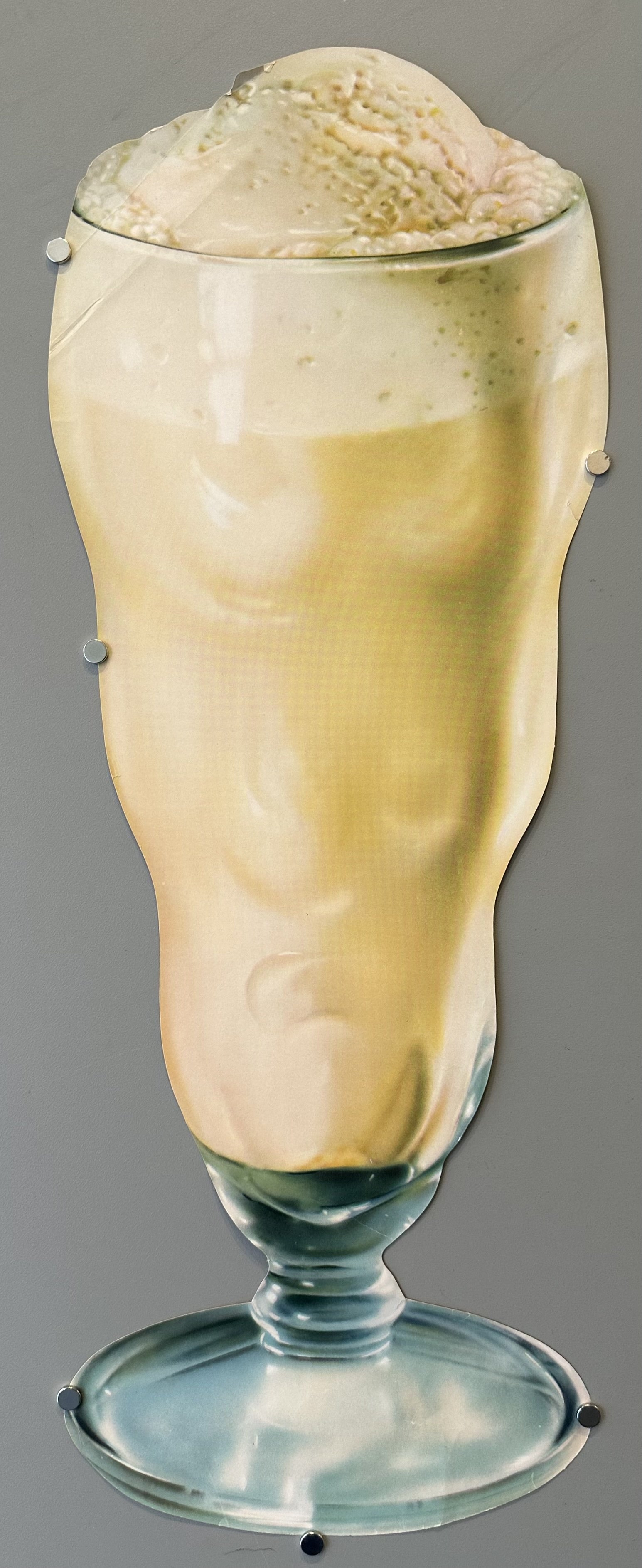 a vintage image of a tall glass filled with a frothy, vanilla-colored beverage, likely a milkshake or ice cream float Condition:Excellent