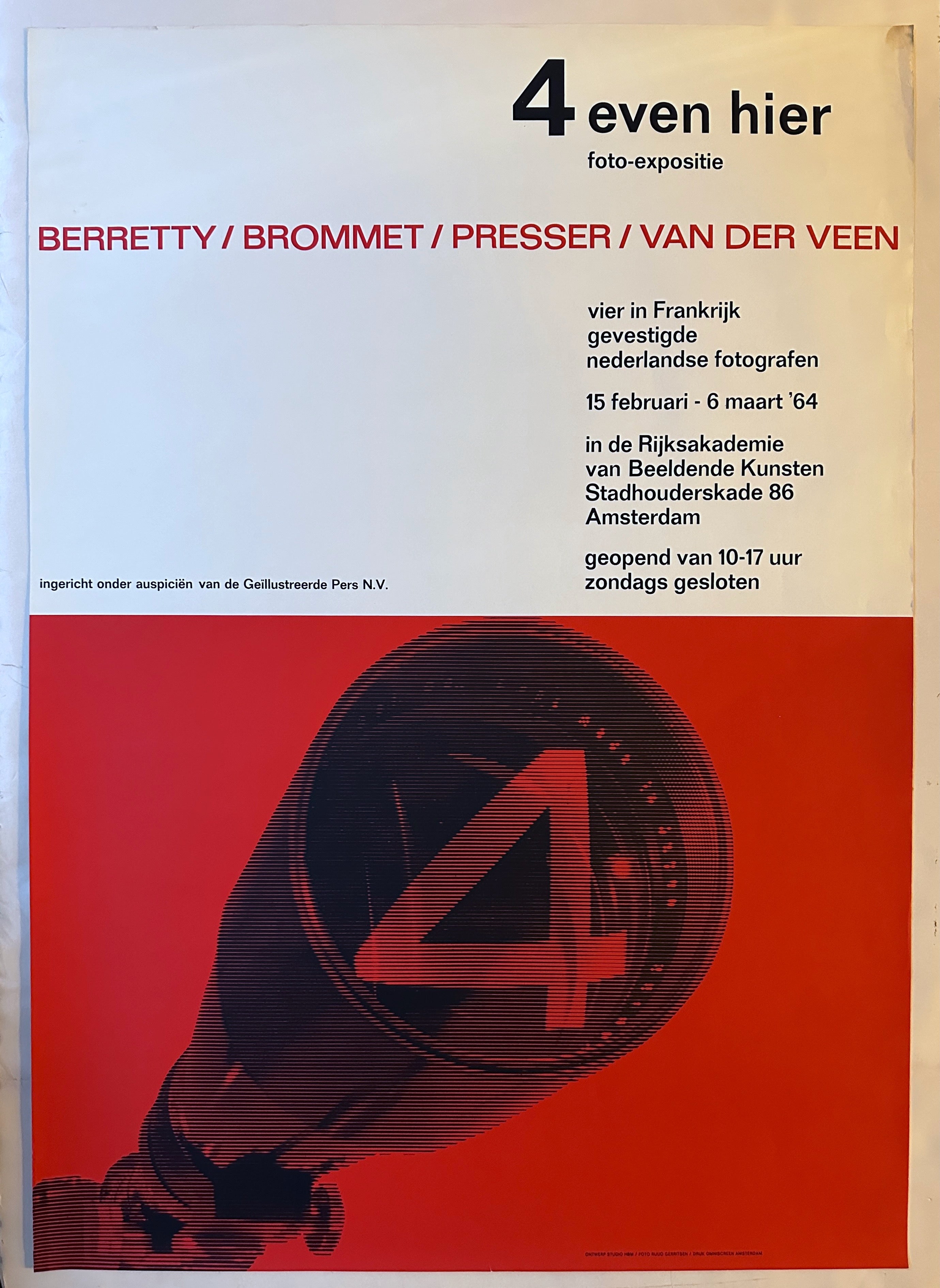"4 even hier foto-expositie / Berretty/Brommet/Presser/Van Der Veen / vier in Frankrijk gevestigde nederlandse fotografen / 15 februari - 6 maart '64 / in de Rijksakademie van Veeldende Kunsten Stadhouderskade 86 Amsterdam / geopend van 10-17 uur zondags gesloten"