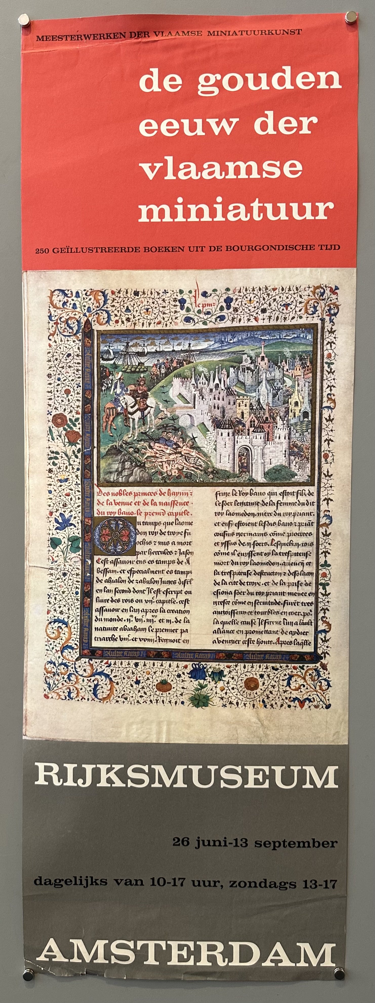 English translation: "Masterpieces of Flemish Miniature Art / the golden age of Flemish miniature / 250 Illustrated Books from the Burgundian Period / Rijksmuseum / June 26 - September 13 / daily from 10 am to 5 pm, Sundays 1 pm to 5 pm / Amsterdam"