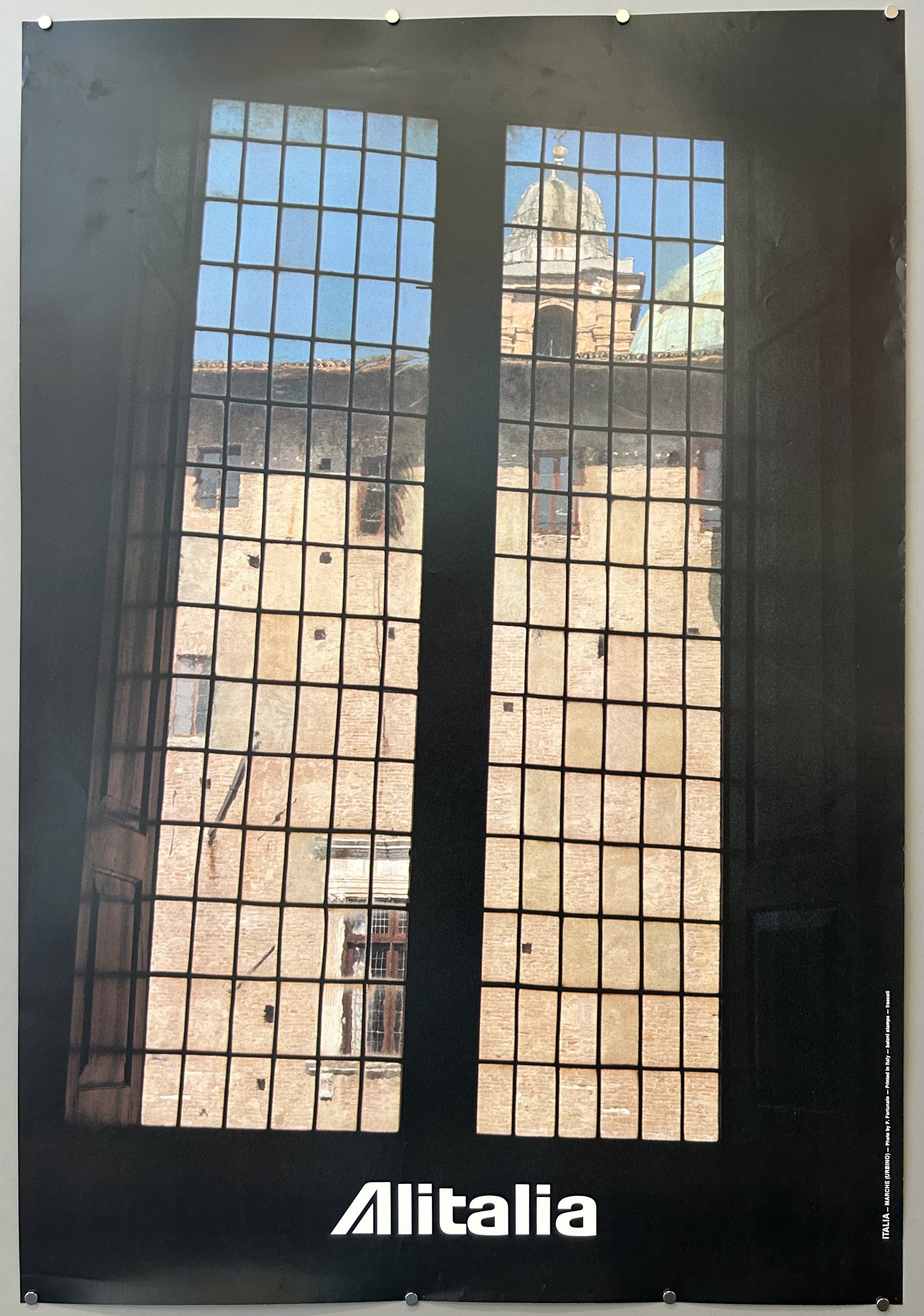 Vintage advertising poster from Alitalia featuring a photo taken in Urbino, a city in Marche.