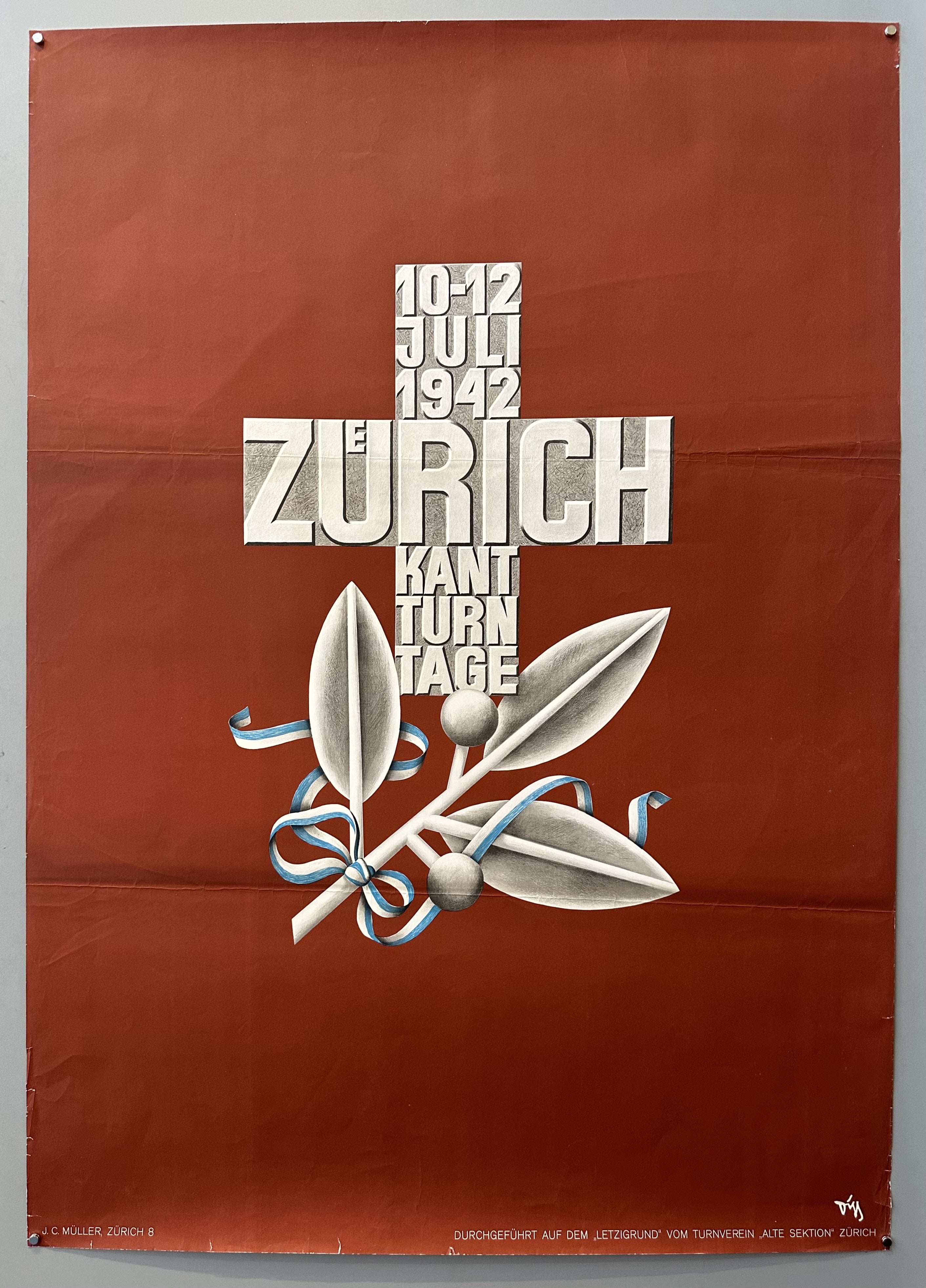 This poster was created for the 1942 Zurich Cantonal Gymnastics Festival and incorporates the Swiss flag into its design.