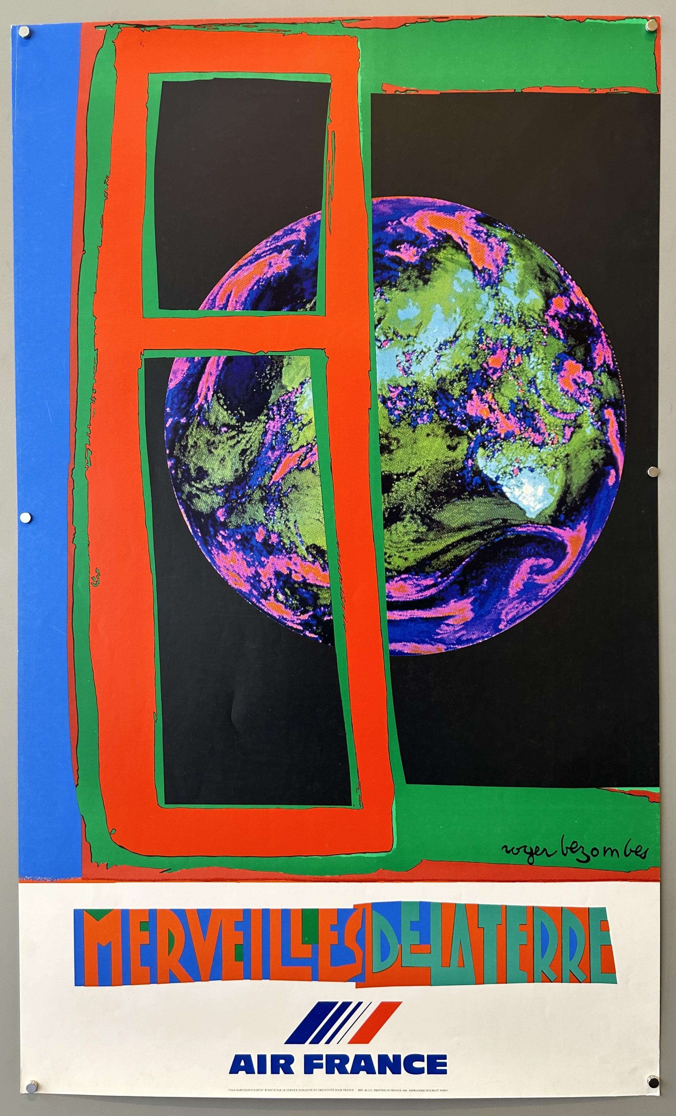 In the early 1970s, Air France commissioned Roger Bezombes to do a series of posters advertising travel with the airline. Bezombes was a multimedia French artist known for his vibrantly colored pieces. His quasi-abstract posters are filled with an amazing array of details, from different textures to hidden images. He held an obsession with found objects, creating a new type of collage. Bezombes was talented in many fields — working not only with graphic design, but fashion and sculpting, these mediums often bled into his poster work, forming his own distinct style.