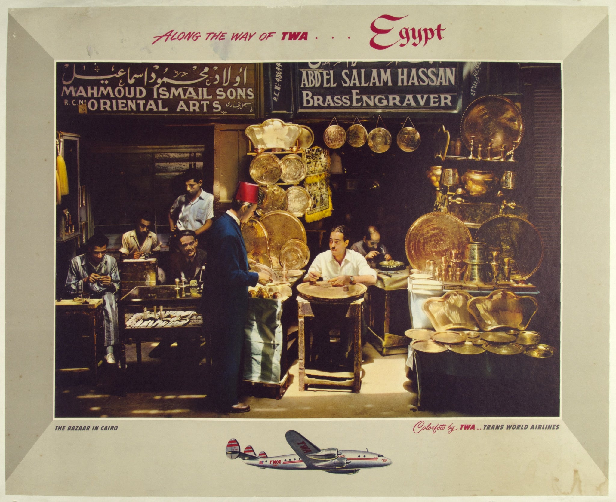 "Along the way of TWA... Egypt. The Bazaar in Cairo. Colorfoto by TWA... Trans World Airlines."