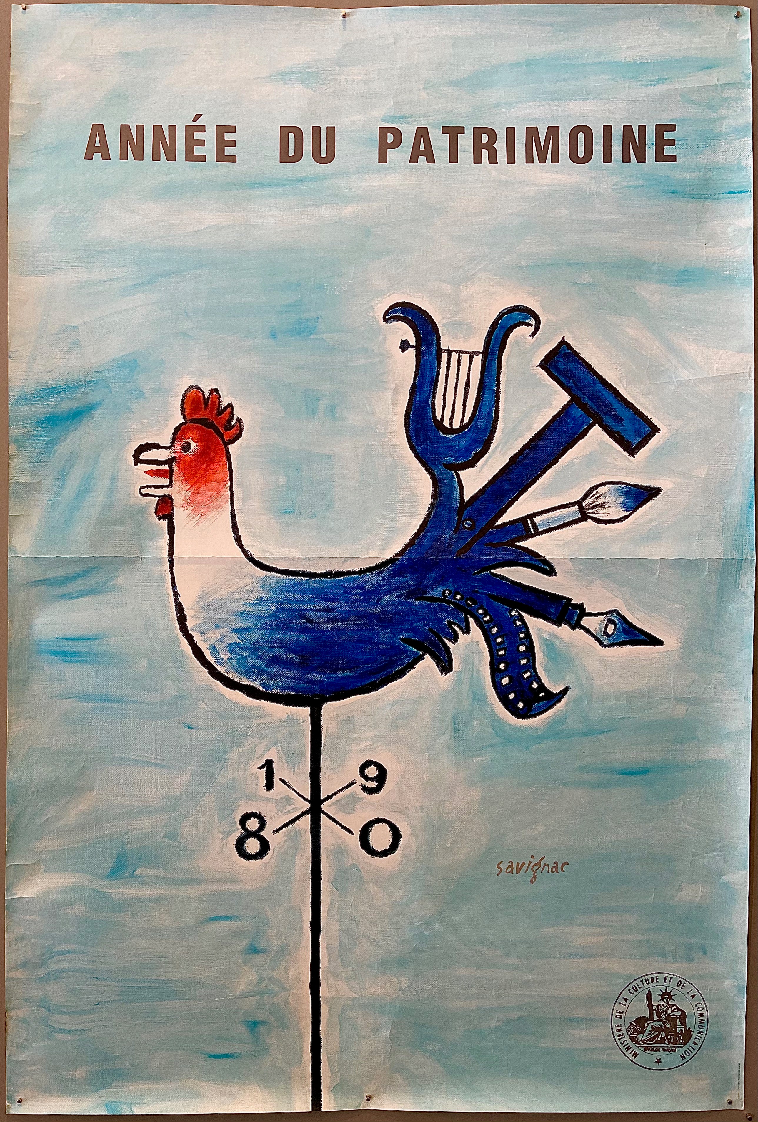 Original French poster by iconic graphic artist Raymond Savignac. The poster was commissioned by the French government to be be the official poster for France 's Year of Heritage, a year dedicated to celebrating and exploring French culture and history.