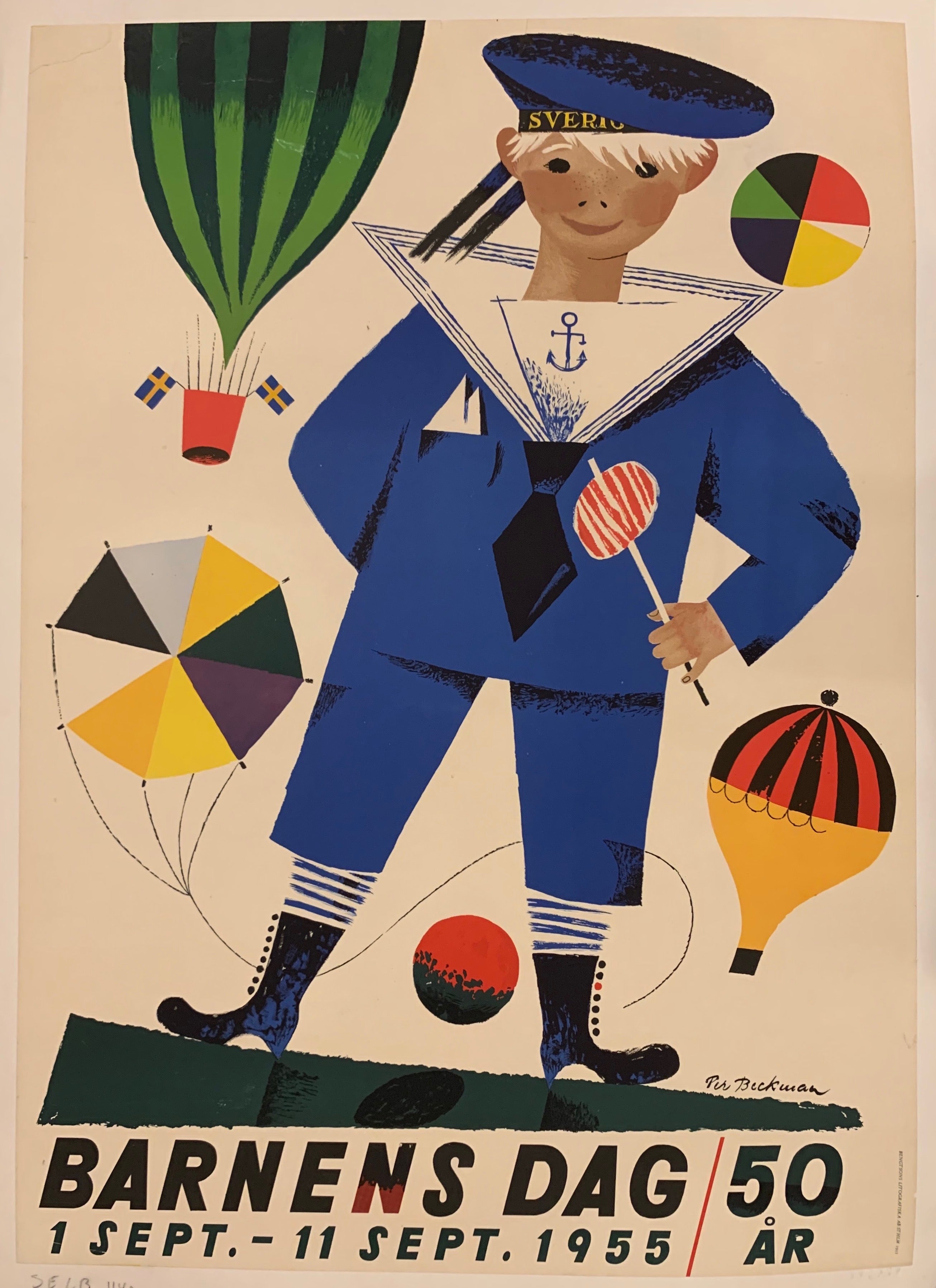 Vintage Swedish poster for a week-long celebration of Children's Day. The charming illustration of a boy in a sailor suit, surrounded by various colorful toys, perfectly captures the light-hearted fun of this holiday.