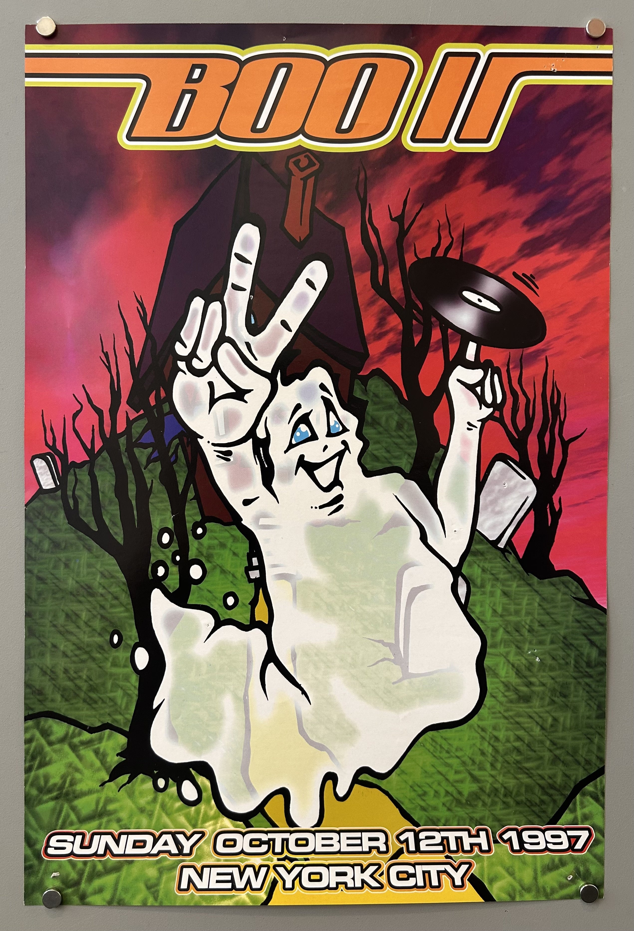 Groovy poster promotes an October 12th Halloween event in New York City. Includes DJs, Hip Hop Artists, and more at a midtown venue.