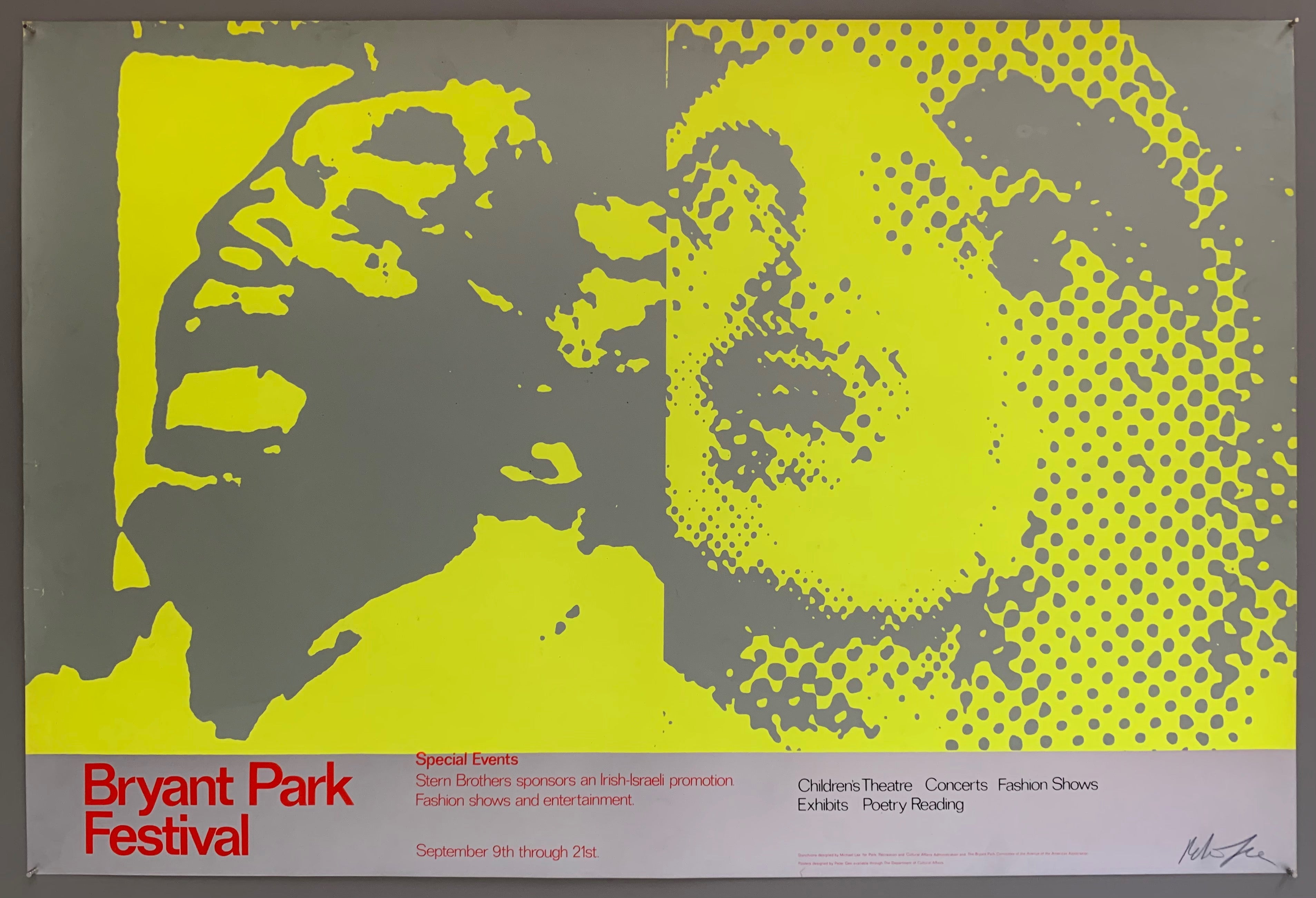 Original silkscreen print by artist Peter Gee advertising a festival in Bryant Park. A man and a woman are shown with dramatic expressions, the highlights and shadows colored in a distinctly pop art style. The colors are just fantastic—a neon yellow on silver.