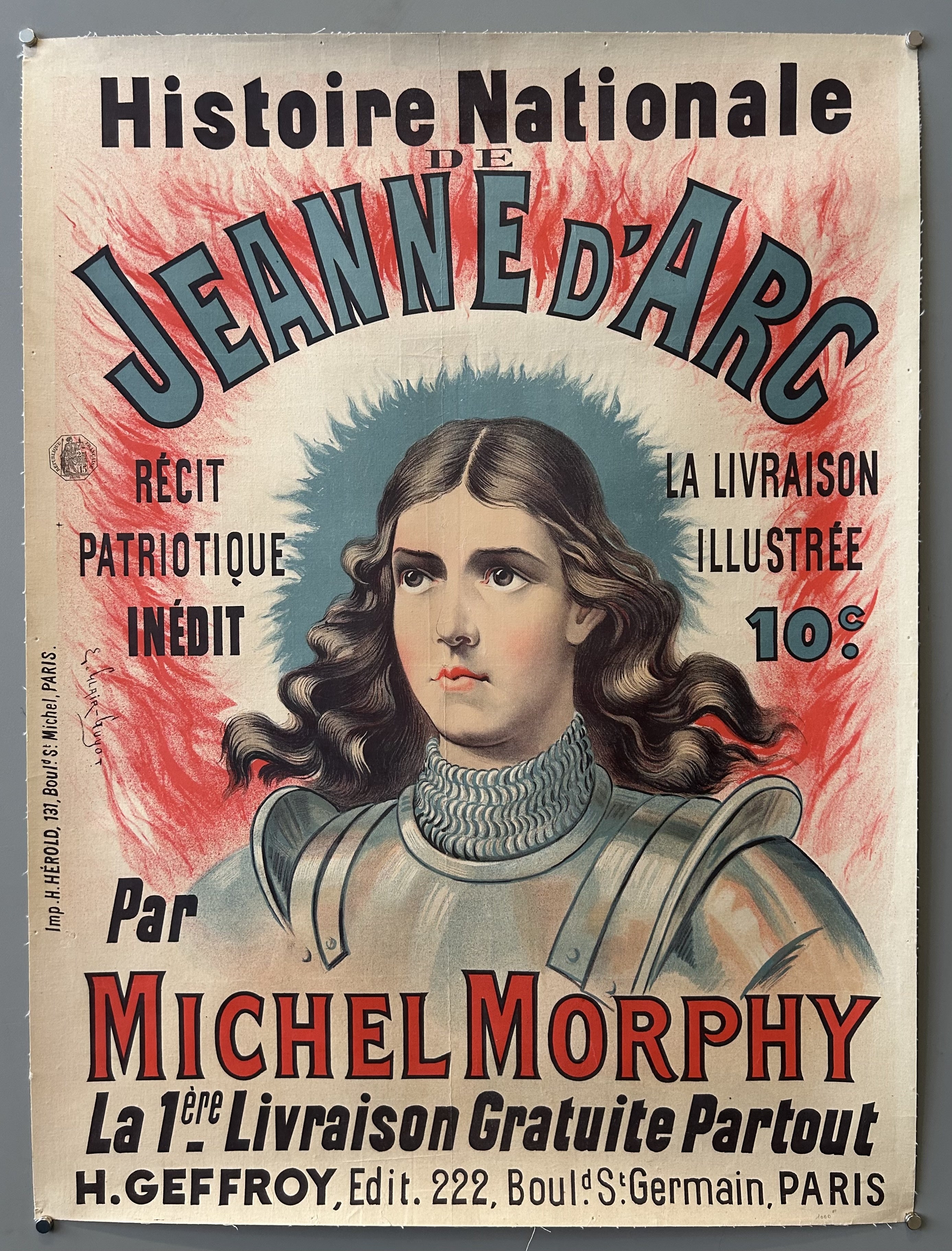 English translation: "National History of Joan of Arc / Unpublished Patriotic Story / The Illustrated Delivery 10c. / by Michel Morphy / The 1st Free Delivery Everywhere / H. Geffroy"