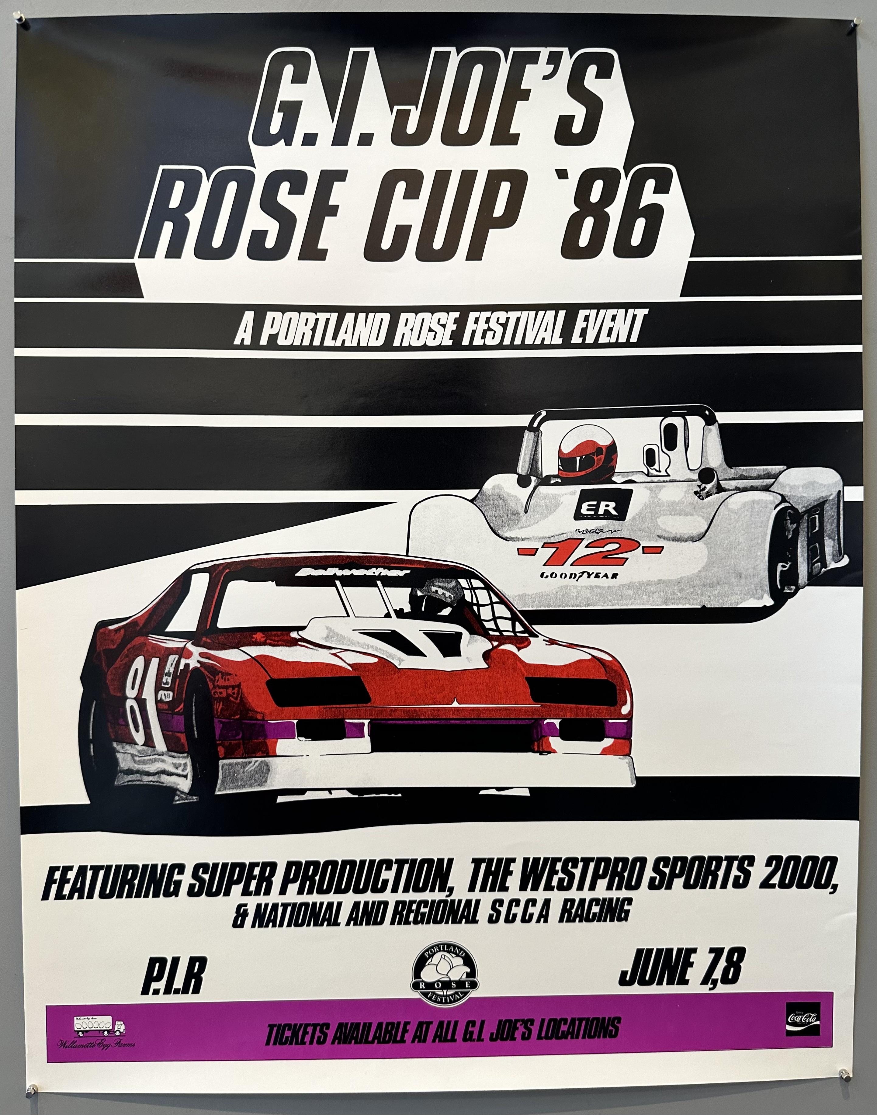 "G.I. Joe's Rose Cup '86 / A Portland Rose Festival Event / Featuring Super Production, the Westpro Sports 2000 & National and Regional SCCA Racing / P.I.R. June 7, 8 / Tickets Available at all G.I. Joe's Locations"
