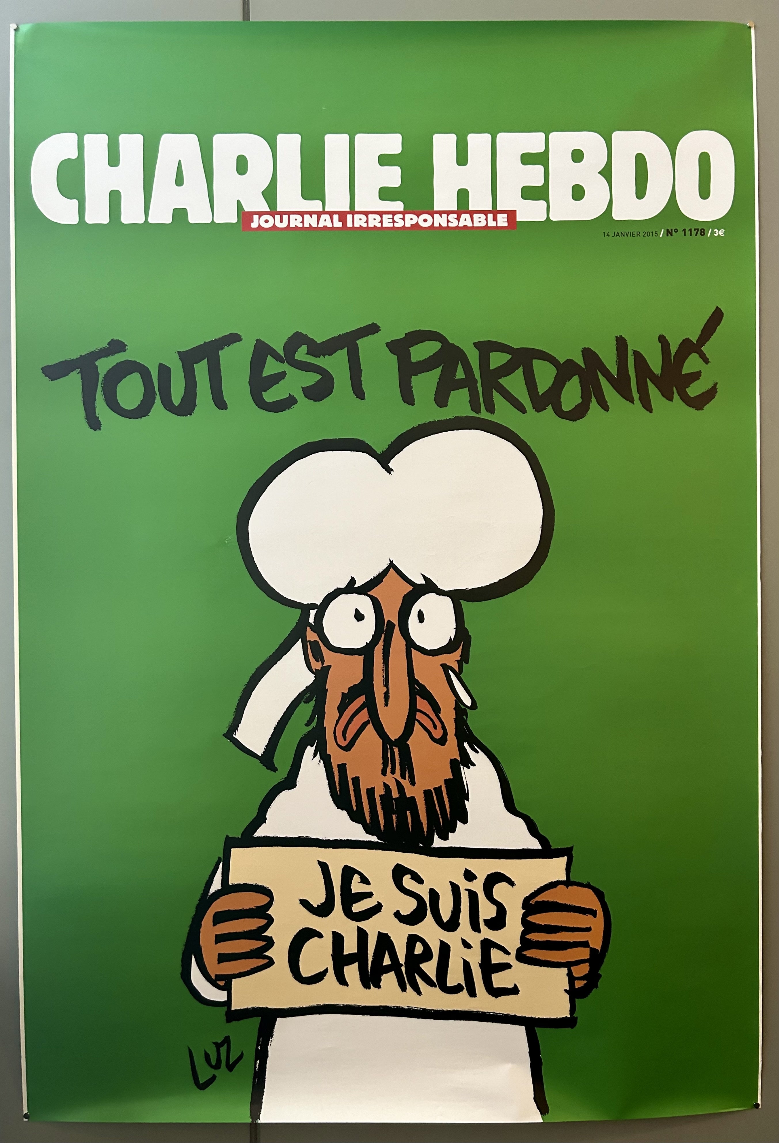 Cover page from the French satirical magazine Charlie Hebdo, the first issue published immediately after the January 2015 terrorist attack on its office that killed at least 12 people. The magazine has long been famously controversial for its satire, especially its cartoon depictions of Muhammed, which largely triggered not only this most deadly attack but multiple others (2011, 2020). The phrase "Je Suis Charlie" ("I am Charlie") became a sign of solidarity in the protests and gatherings across the nation that ensued in the days following the 1/7/15 attack. On this cover, published a week later, text underneath the magazine's title reads "irresponsable newspaper," a cartoon figure of Muhammed holds a sign reading "Je Suis Charlie," and above him the headline says "Everything is forgiven."