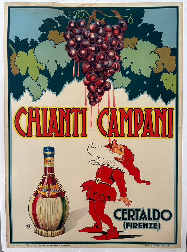 A red elf drinks the juice of red grapes. The poster was made in 1939 to advertise Chianti Campani, Italy's famous red wine.
