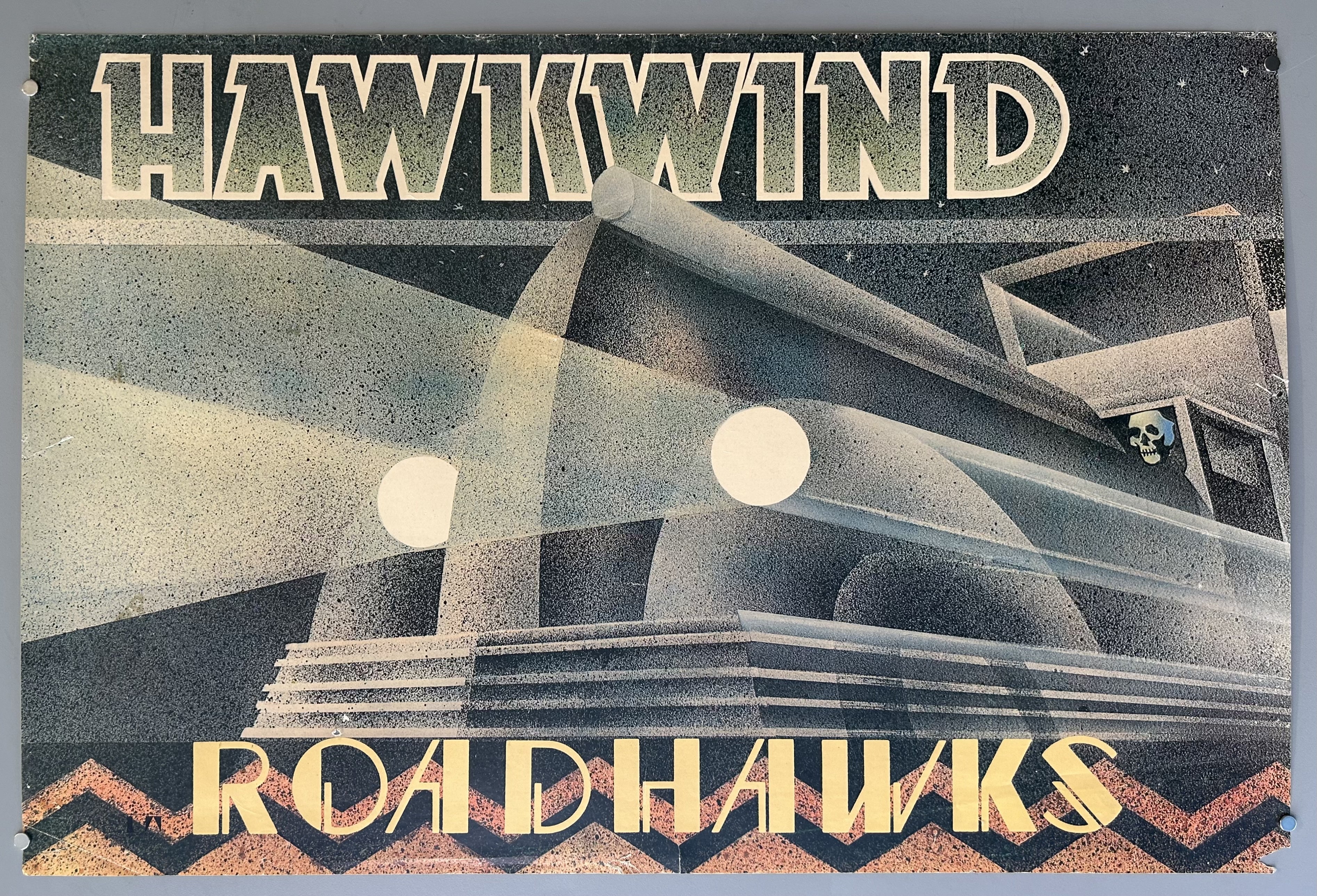 Promotional poster using the cover design from band Hawkwind's album 'Roadhawks'.