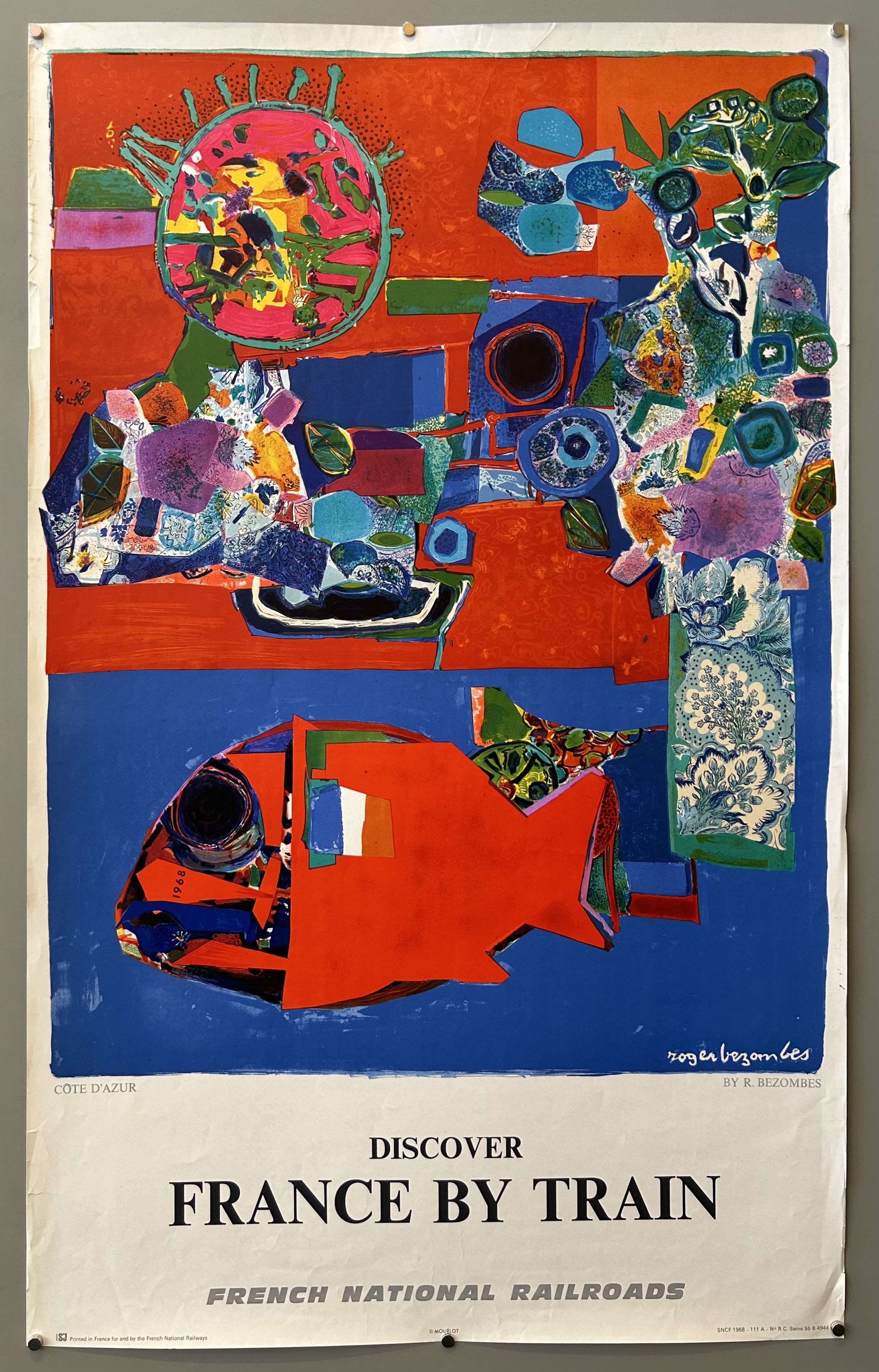 Issued by the French National Railroads, this print depicts an abstract scene of the Cote D'Azur, including a fish in the blue sea.