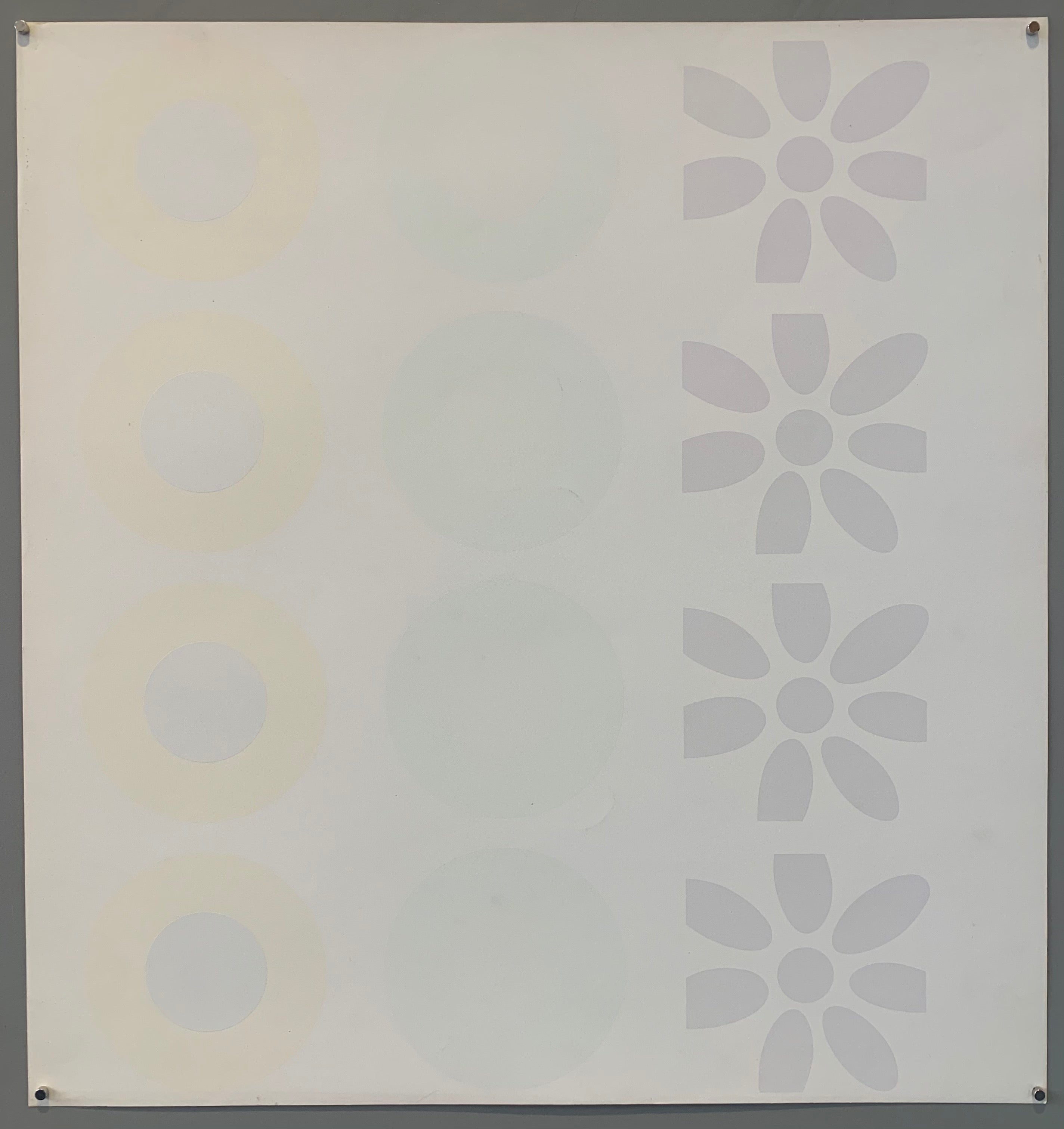 Peter Gee was a British-born artist who rose to prominence as part of the 60s pop art movement in New York. Before moving to Manhattan in 1962, Gee had achieved moderate success in Europe. At 18, he joined the British army as a graphic designer, and soon after, his work was exhibited in the galleries of Paris and London. It wasn’t until New York, however, that Peter Gee’s now iconic style really took off. A Peter Gee print is instantly recognizable: the arrangement of basic shapes, usually targets and daisies, over strips of color has an immediacy that is totally its own. Through his work, Gee balanced the technical and sensual. Certainly, a great degree of expertise was required to create his silkscreens: the technical skill demanded to print vibrant colors and distinct shapes on material as finicky as rice paper cannot be understated. Yet, as Gee would agree, his work was much more than just applied art. Gee was an ardent student of color theory, and his color combinations are startling not just for their abstract aesthetic appeal, but for the individual artistic choice evident in them. Like much of pop art, Gee’s art directly confronted the consequences of mass production. Gee kept the composition of his prints largely consistent, and yet each manages to feel uniquely individual nonetheless.