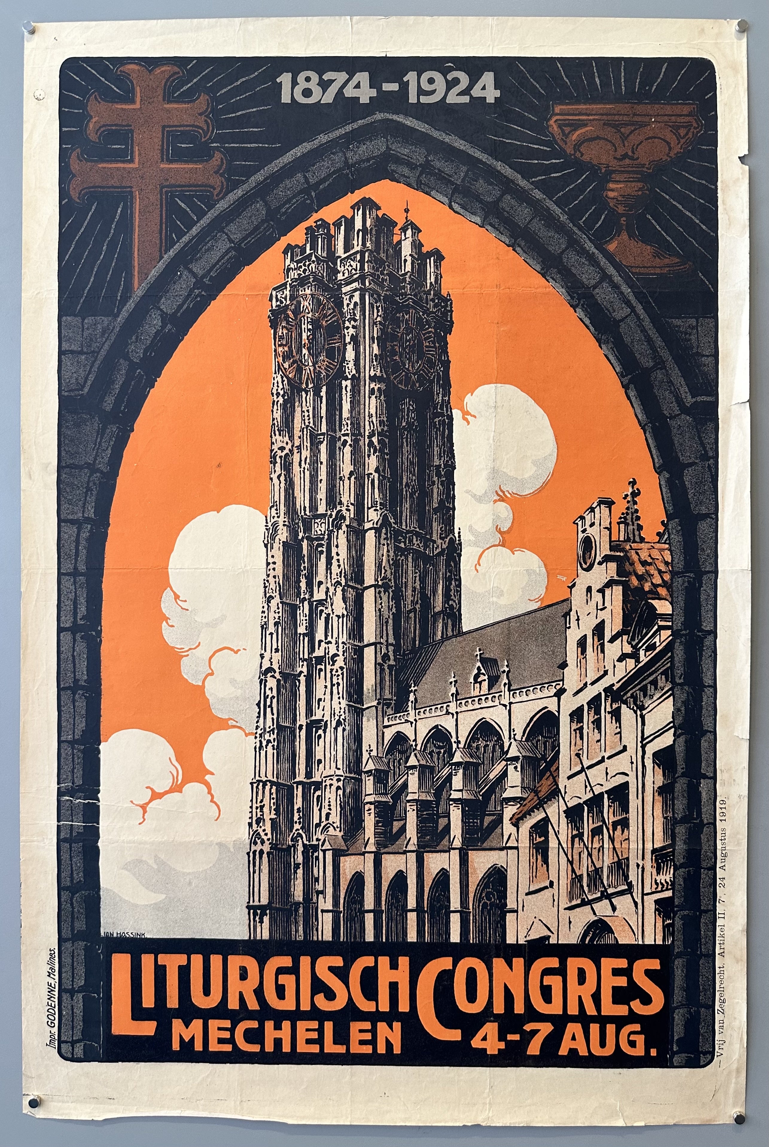 Liturgical Congress poster from Mechelen, Belgium featuring an artistic rendition of St. Rumbold's Cathedral.