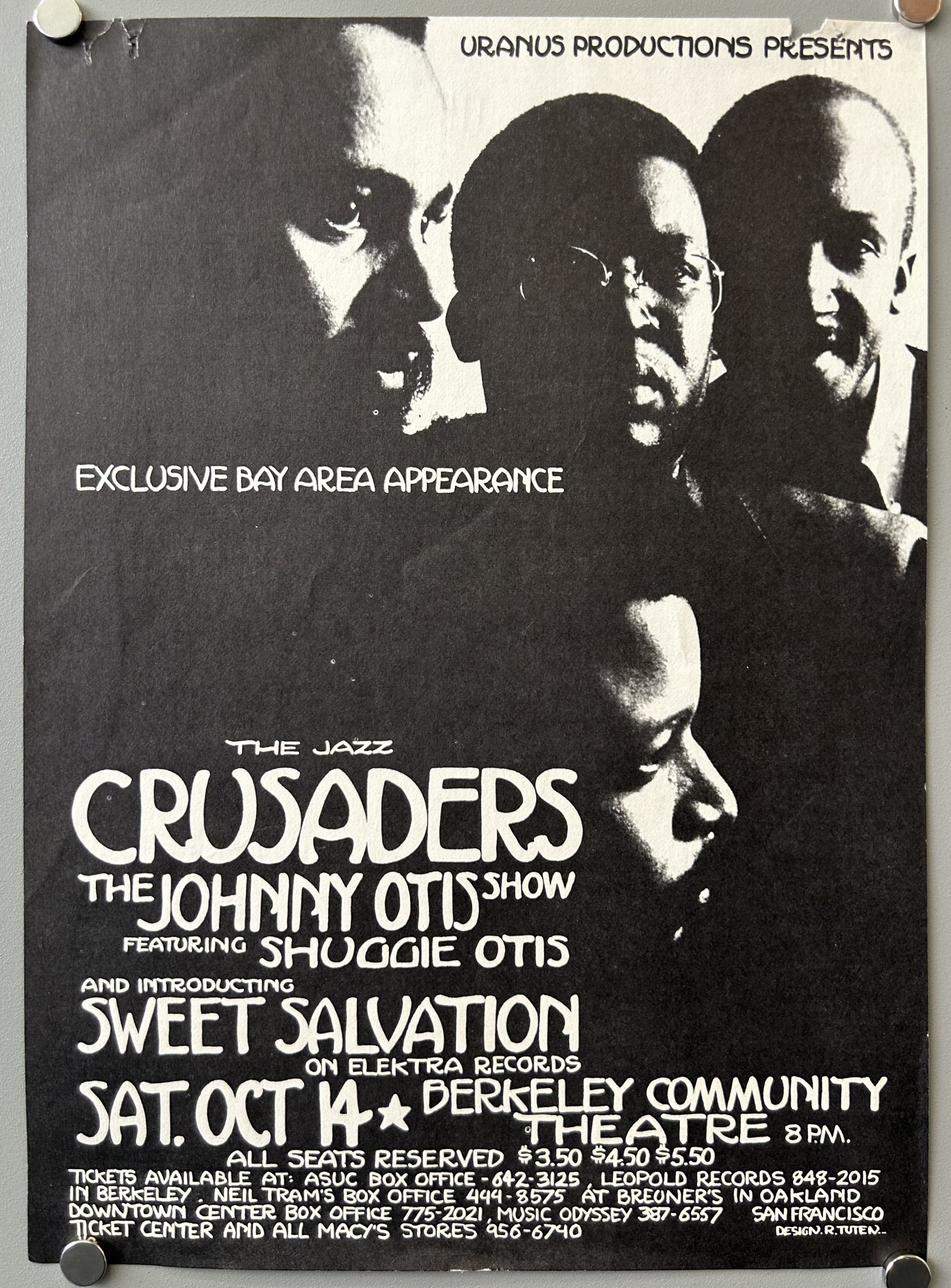 Promoting a concert in Berkeley with The Jazz Crusaders, The Johnny Otis Show featuring Shuggie Otis, and Sweet Salvation.