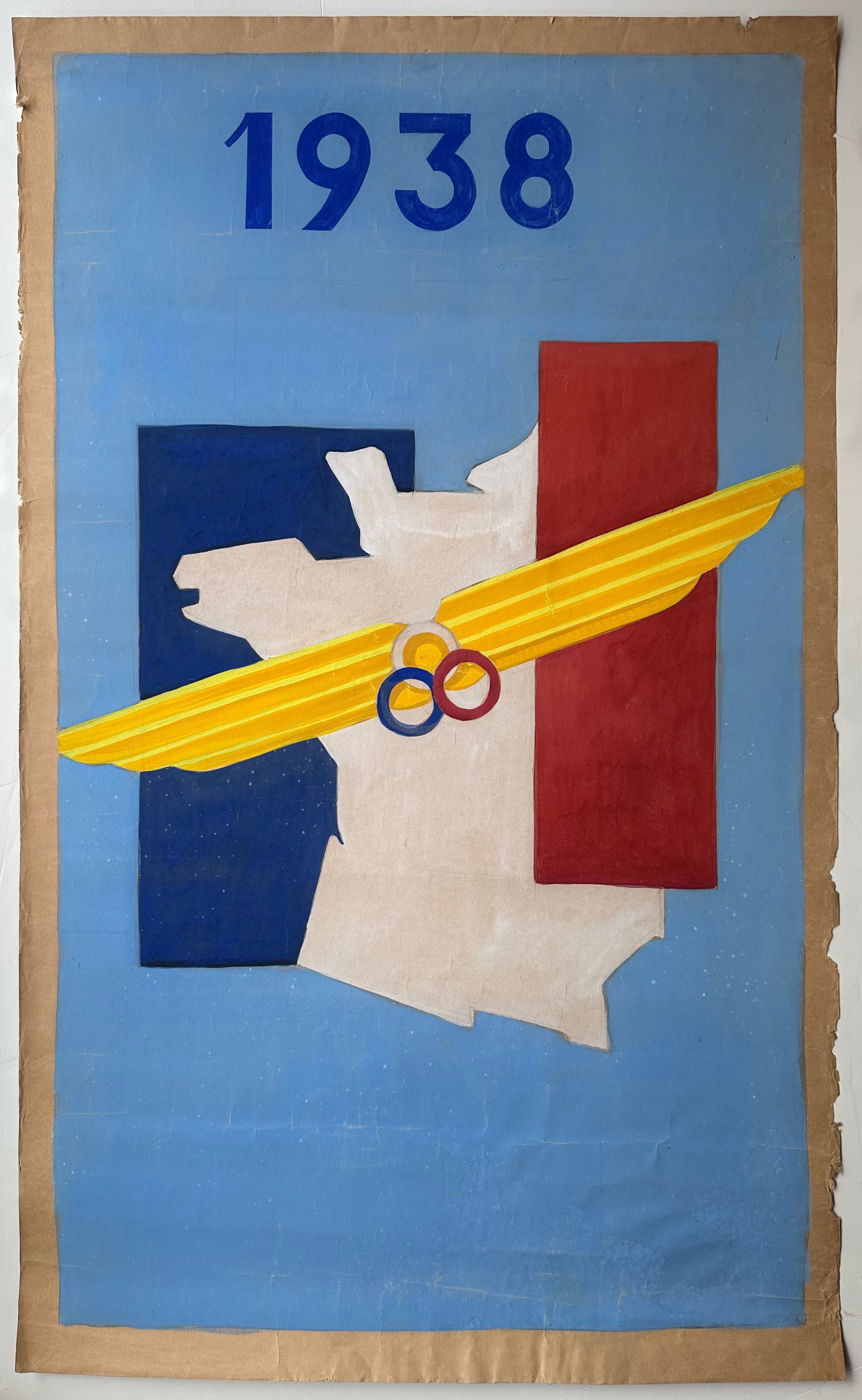 Original artwork for the 2nd European Athletics Championships, a continental athletics competition for European athletes. The art features an outline of France (where the event was hosted) as the white center of the French flag with the event's emblem overlayed on top.