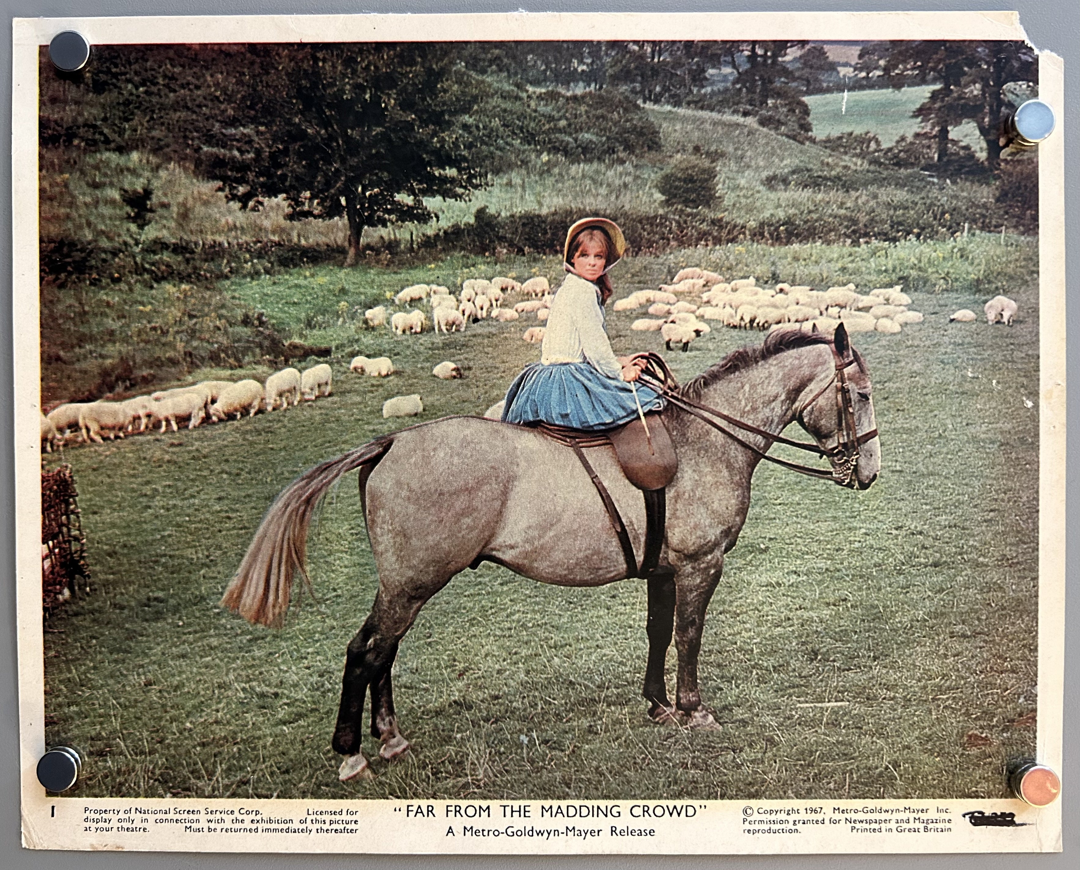 Promotional piece for 1967 film release based on Thomas Hardy's renowned novel. This British drama focuses on Bathsheba Everdene (Julie Christie), and three very different suitors -- Francis Troy (Terence Stamp), an intense soldier; William Boldwood (Peter Finch), a middle-aged farmer; and Gabriel Oak (Alan Bates), a shepherd of modest means.