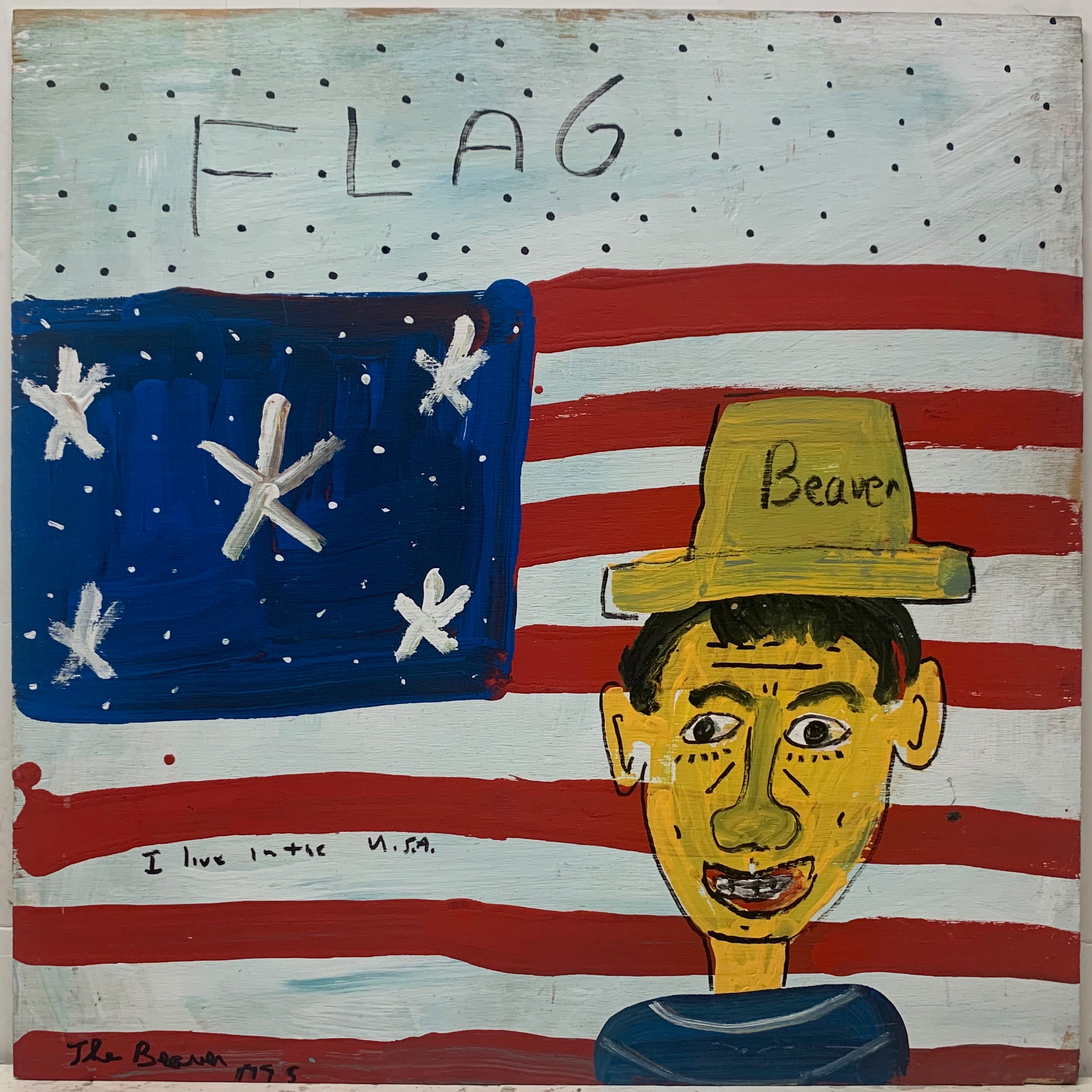 A self-portrait, identified by the hate the man wears labeled "Beaver," in front of an American flag that is noticeably missing more than a few stars.