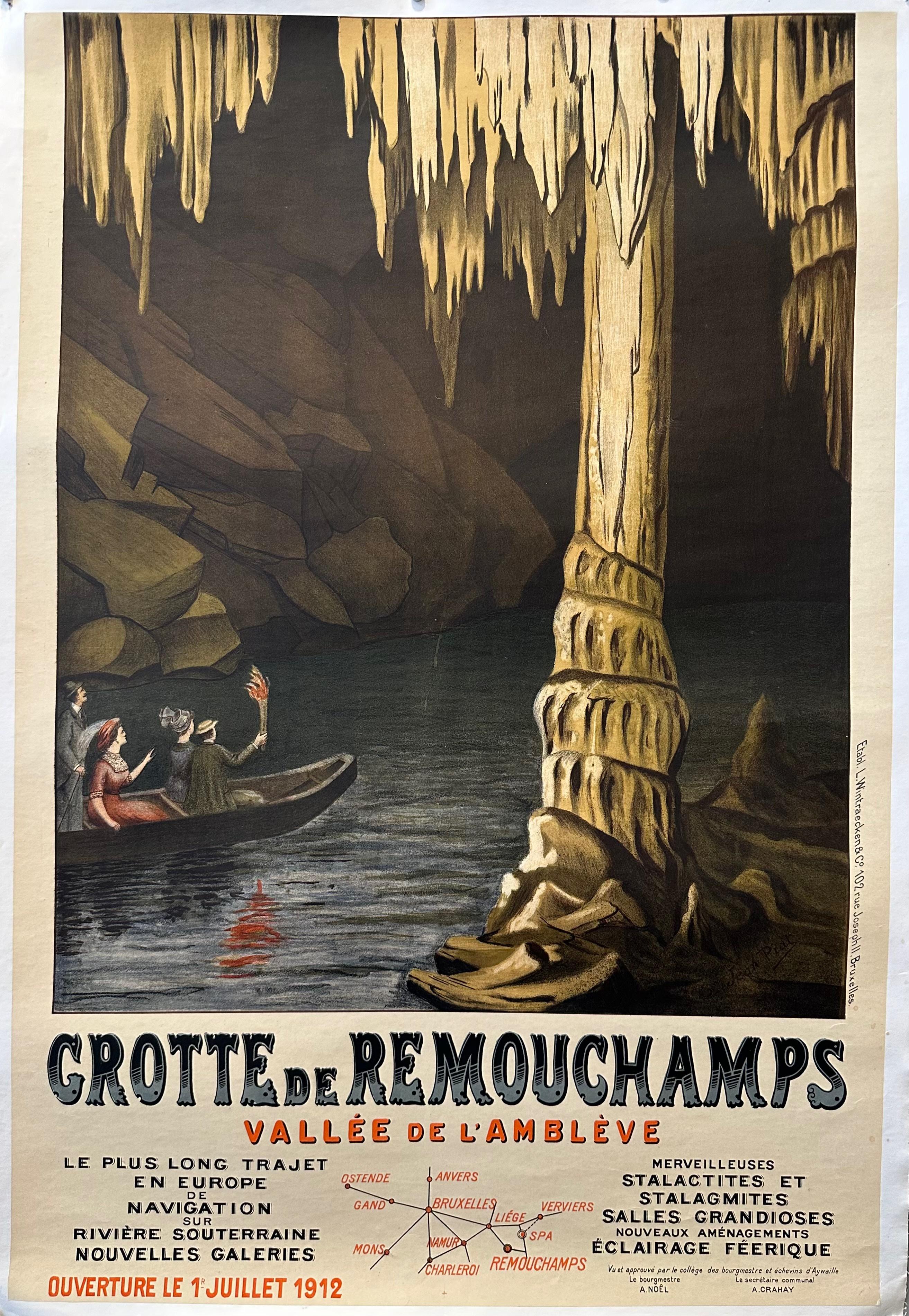 English translation: "Remouchamps Cave / Amblève Valley / The Longest Navigation Route in Europe on the Underground River New Galleries / Opening on July 1, 1912"