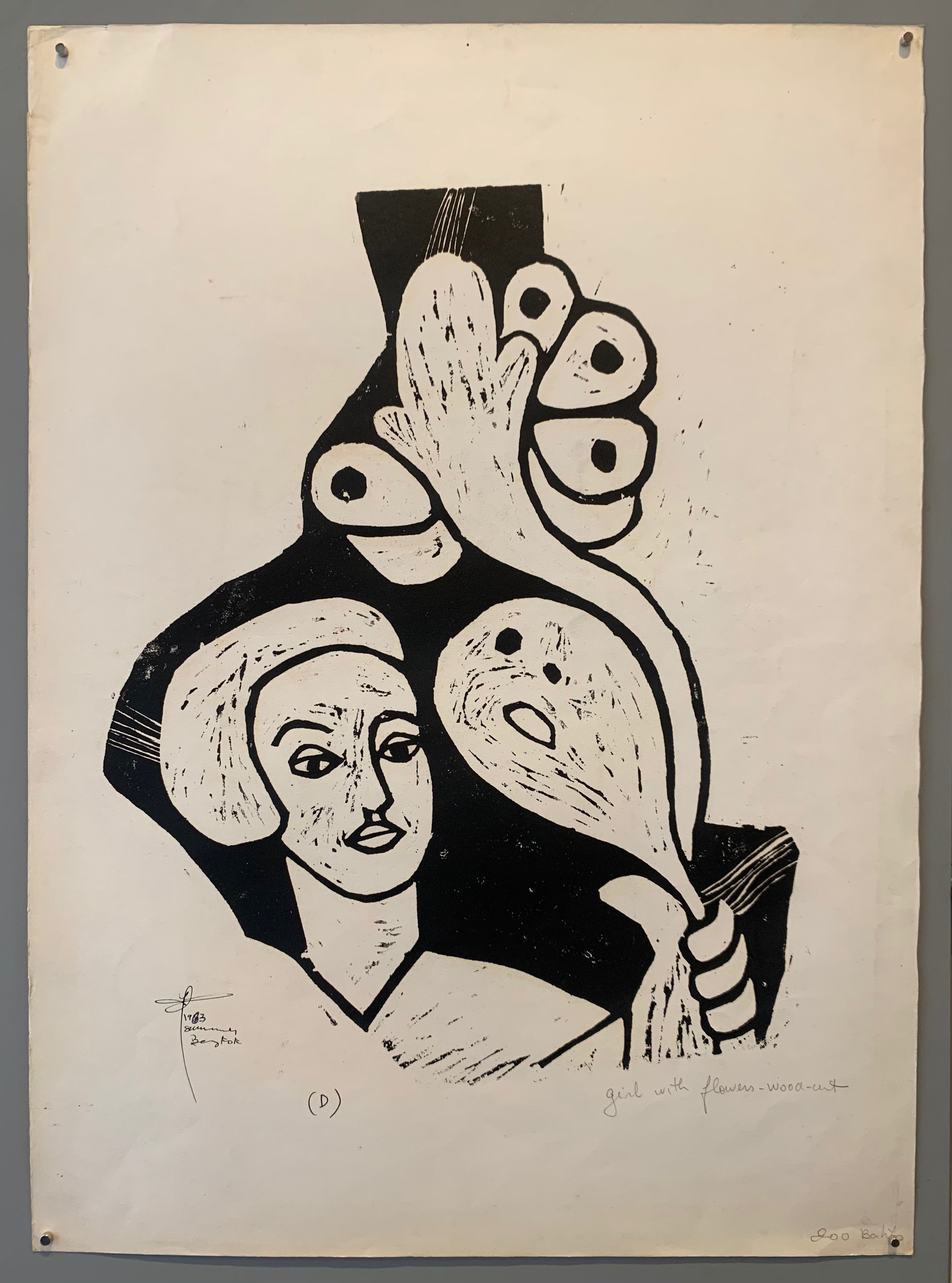 Original woodblock print by Brazilian artist Joaquim Pedro Ribeiro Araujo. Illustrated in black and white is a girl, a comically unimpressed look on her face, holding out a bouquet of amorphous flowers. Joaquim hand-signed this print in the lower left corner and wrote where this particular print was produced: Bangkok. In the lower right the title of the piece is written.
