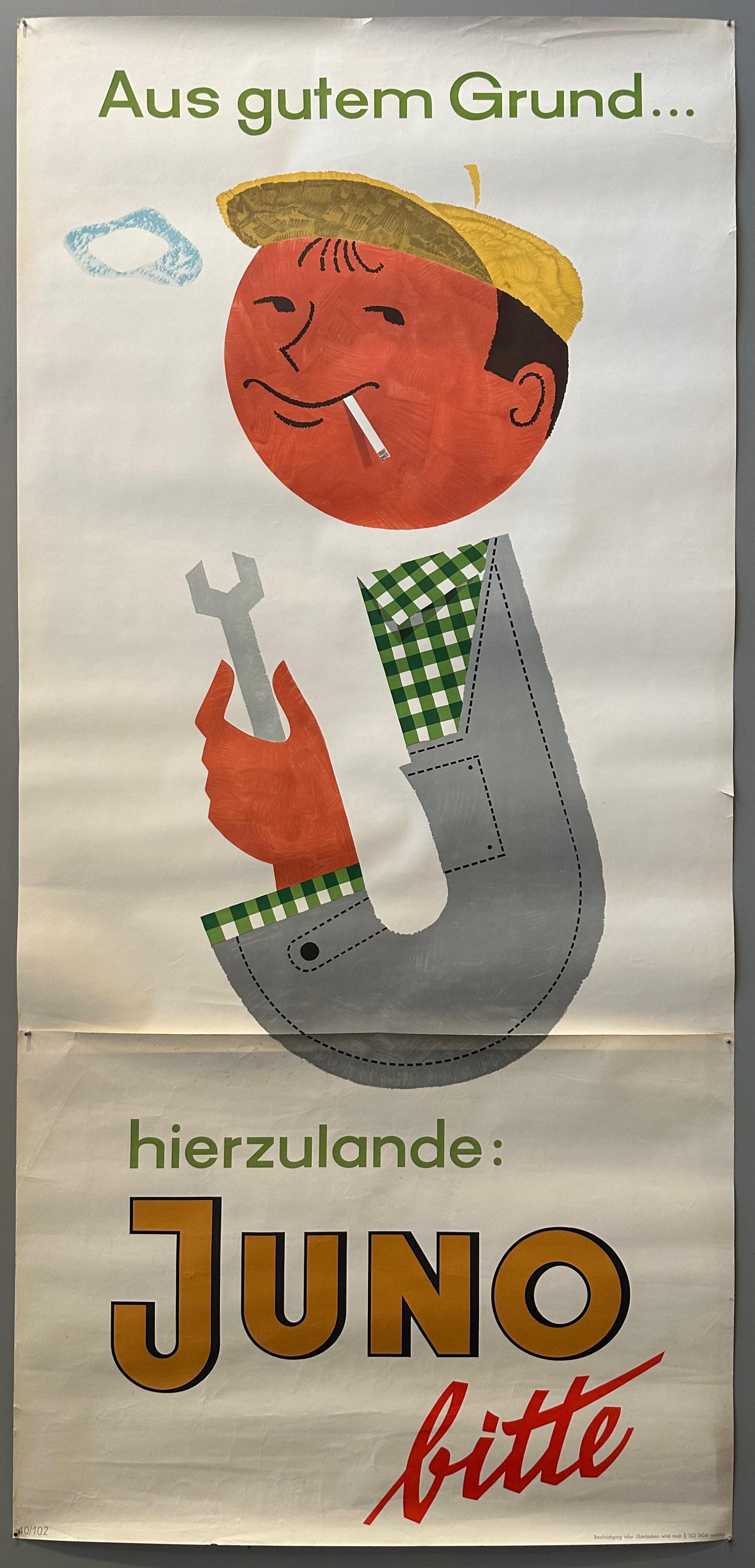 Juno was a German cigarette brand known for their creative advertising design. Their posters from this era often featured characters smoking their cigarettes, with their arms bent into a 'J'.