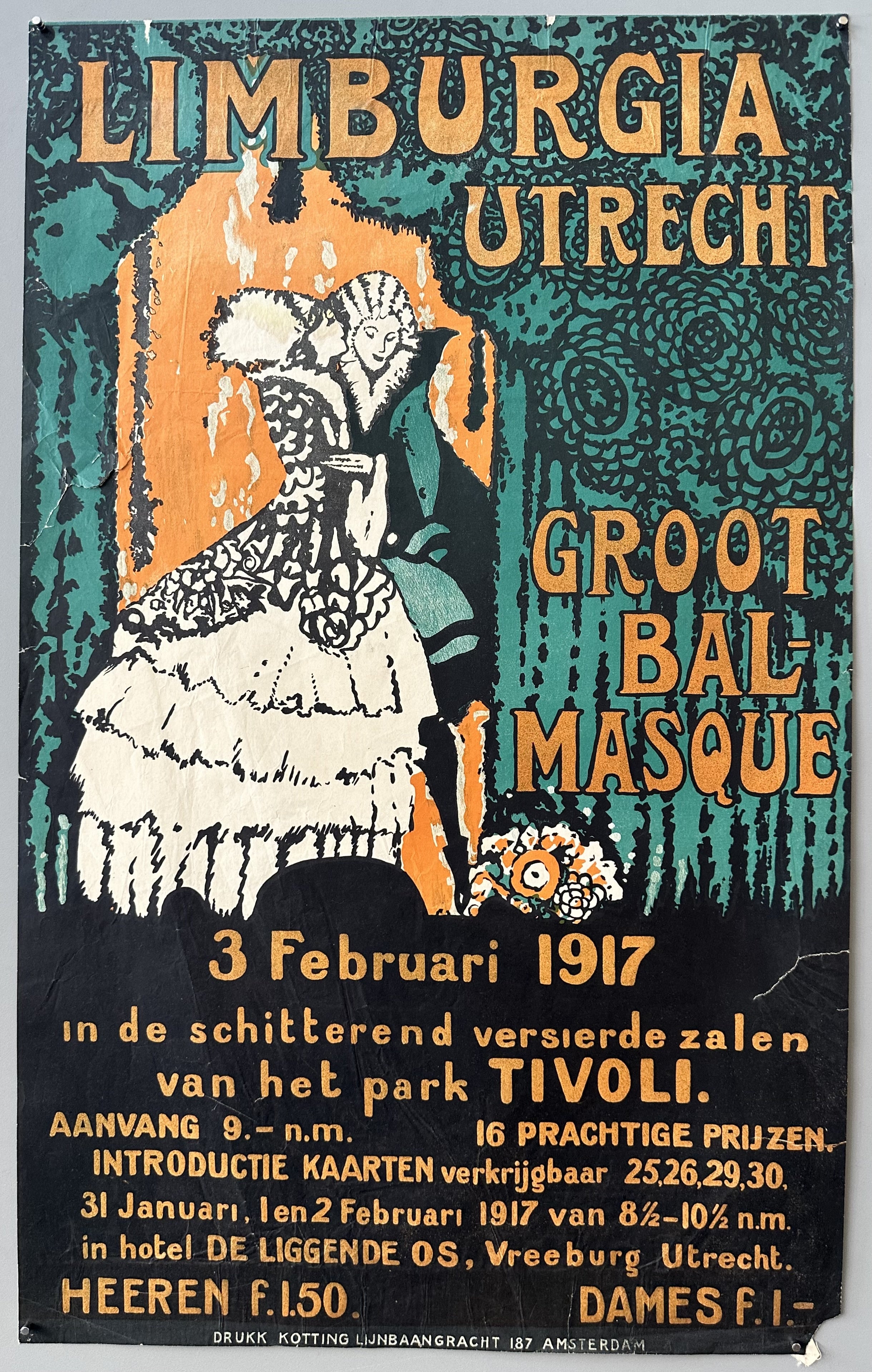 English translation: "Limburgia Utrecht / Grand Masque Ball / 3 February 1917 in the beautifully decorated halls of the TIVOLI park. / Starts at 9 p.m. 16 wonderful prizes"