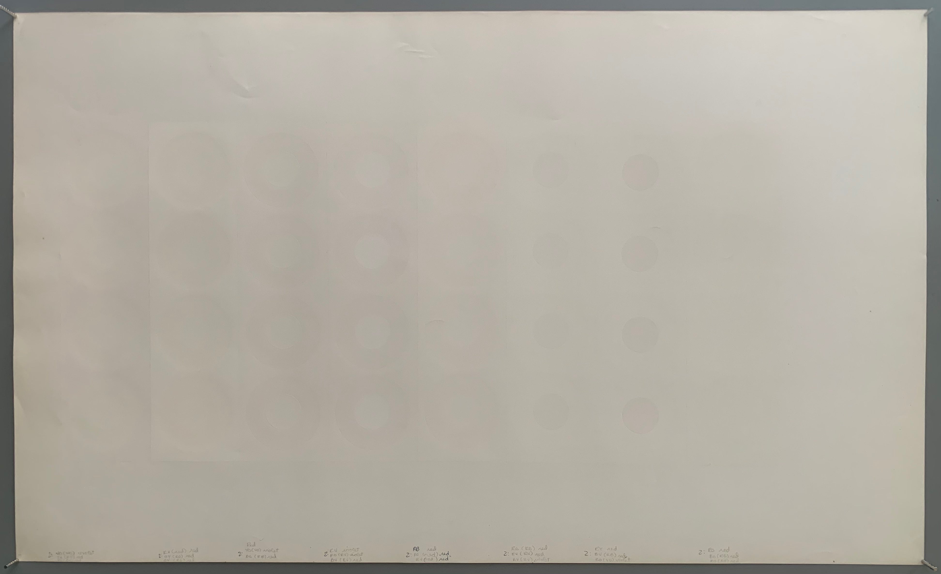 Description: Original silkscreen print by artist Peter Gee showing a rectangle made up of eight panels. The panels are various cream colors with four targets lined up in each. This is an interesting variation of his usual neon works. The print has a mat as the border. Hand signed by Gee. Peter Gee was a British-born artist who rose to prominence as part of the 60s pop art movement in New York. Before moving to Manhattan in 1962, Gee had achieved moderate success in Europe. At 18, he joined the British army as a graphic designer, and soon after, his work was exhibited in the galleries of Paris and London. It wasn’t until New York, however, that Peter Gee’s now iconic style really took off. A Peter Gee print is instantly recognizable: the arrangement of basic shapes, usually targets and daisies, over strips of color has an immediacy that is totally its own. Through his work, Gee balanced the technical and sensual. Certainly, a great degree of expertise was required to create his silkscreens: the technical skill demanded to print vibrant colors and distinct shapes on material as finicky as rice paper cannot be understated. Yet, as Gee would agree, his work was much more than just applied art. Gee was an ardent student of color theory, and his color combinations are startling not just for their abstract aesthetic appeal, but for the individual artistic choice evident in them. Like much of pop art, Gee’s art directly confronted the consequences of mass production. Gee kept the composition of his prints largely consistent, and yet each manages to feel uniquely individual nonetheless. Gee’s artistic influences are myriad. His prints were the modern evolution of Matisse’s cut-outs, and both revelled in the simple beauty of form. His target iconography is reminiscent of Jasper Johns’, and both used this design to combine the abstract (circles) with the representational (targets). And his approach to design was inspired from his studies of Bauhaus, namely the principle that the whole man-made environment was an object of design. But Gee influenced the art scene as much as he was influenced by it. After finding success in the pop art scene—exhibiting with the likes of Andy Warhol and Robert Indiana in MoMA—Gee went on to teach design at the New School, The School of Visual Arts, and the Harvard Architecture School. Gee’s work and his teaching can largely be credited for introducing post-Bauhaus to the United States. He helped propagate the stricter design theories of Bauhaus, while also allowing for an emotional use of color and form. Take the principles, but keep the American attitude towards bending the rules. Moreover, Gee’s design approach is strikingly similar to the growing Swiss Design style of the time. Few other artists could claim to be as much a representative of their time in history as Peter Gee. Today, Gee’s prints are held in permanent collections in MoMA New York, MoMA Kyoto, The Smithsonian, and the Victoria and Albert Museum in London. Gee’s impact on the pop art movement and design at large is keenly felt.