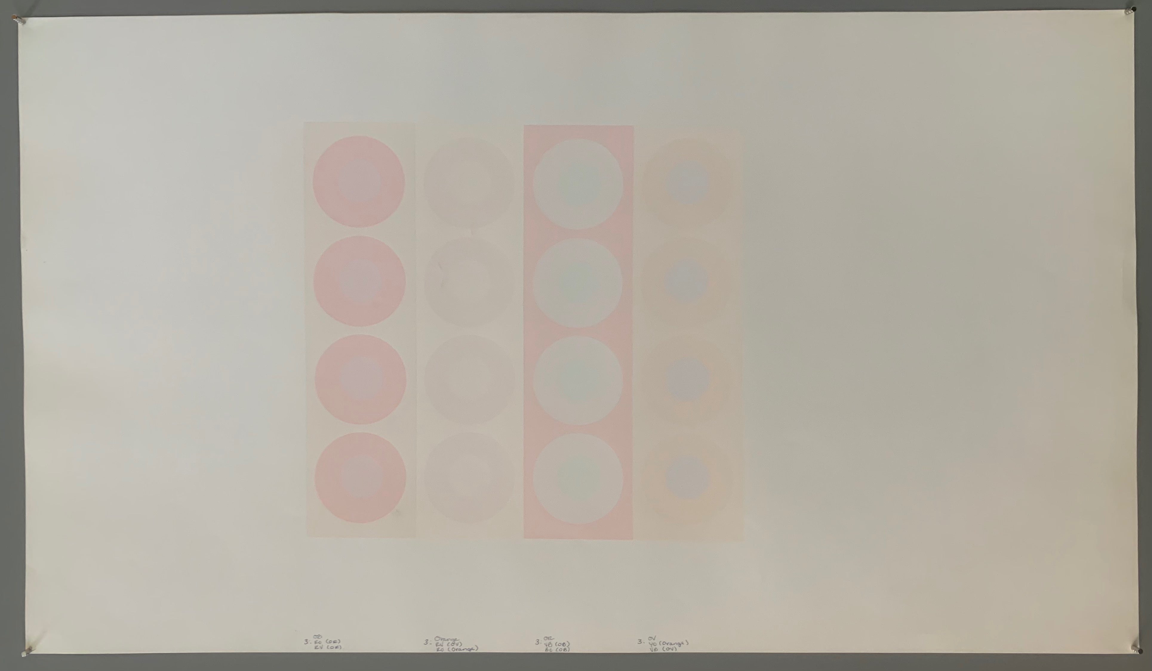 Description: Original silkscreen print by artist Peter Gee showing a rectangle made up of four panels. The panels are various cream colors with four targets lined up in each. This is an interesting variation of his usual neon works. The print has a mat as the border. Hand signed by Gee. Peter Gee was a British-born artist who rose to prominence as part of the 60s pop art movement in New York. Before moving to Manhattan in 1962, Gee had achieved moderate success in Europe. At 18, he joined the British army as a graphic designer, and soon after, his work was exhibited in the galleries of Paris and London. It wasn’t until New York, however, that Peter Gee’s now iconic style really took off. A Peter Gee print is instantly recognizable: the arrangement of basic shapes, usually targets and daisies, over strips of color has an immediacy that is totally its own. Through his work, Gee balanced the technical and sensual. Certainly, a great degree of expertise was required to create his silkscreens: the technical skill demanded to print vibrant colors and distinct shapes on material as finicky as rice paper cannot be understated. Yet, as Gee would agree, his work was much more than just applied art. Gee was an ardent student of color theory, and his color combinations are startling not just for their abstract aesthetic appeal, but for the individual artistic choice evident in them. Like much of pop art, Gee’s art directly confronted the consequences of mass production. Gee kept the composition of his prints largely consistent, and yet each manages to feel uniquely individual nonetheless. Gee’s artistic influences are myriad. His prints were the modern evolution of Matisse’s cut-outs, and both revelled in the simple beauty of form. His target iconography is reminiscent of Jasper Johns’, and both used this design to combine the abstract (circles) with the representational (targets). And his approach to design was inspired from his studies of Bauhaus, namely the principle that the whole man-made environment was an object of design. But Gee influenced the art scene as much as he was influenced by it. After finding success in the pop art scene—exhibiting with the likes of Andy Warhol and Robert Indiana in MoMA—Gee went on to teach design at the New School, The School of Visual Arts, and the Harvard Architecture School. Gee’s work and his teaching can largely be credited for introducing post-Bauhaus to the United States. He helped propagate the stricter design theories of Bauhaus, while also allowing for an emotional use of color and form. Take the principles, but keep the American attitude towards bending the rules. Moreover, Gee’s design approach is strikingly similar to the growing Swiss Design style of the time. Few other artists could claim to be as much a representative of their time in history as Peter Gee. Today, Gee’s prints are held in permanent collections in MoMA New York, MoMA Kyoto, The Smithsonian, and the Victoria and Albert Museum in London. Gee’s impact on the pop art movement and design at large is keenly felt.