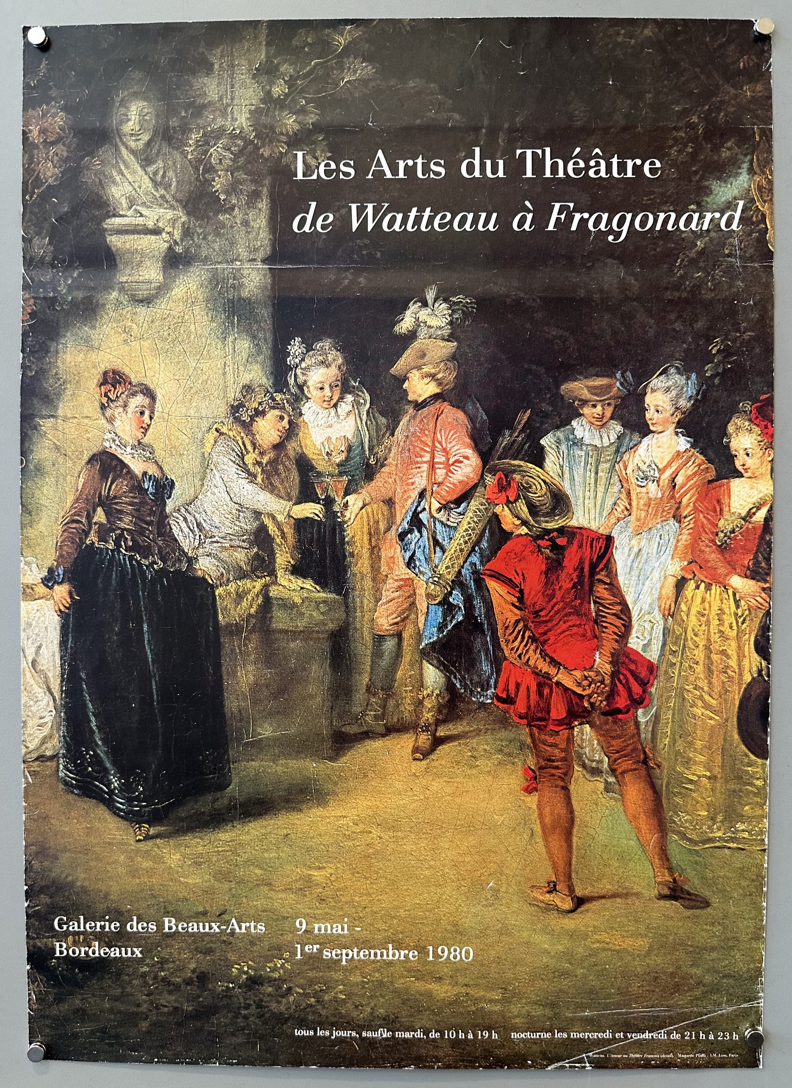 Promoting an exhibition at the Galerie des Beaux-Arts in Bordeaux displaying the arts of theatre from Watteau to Fragonard. Featured is Watteau's "Love in the French Theater."