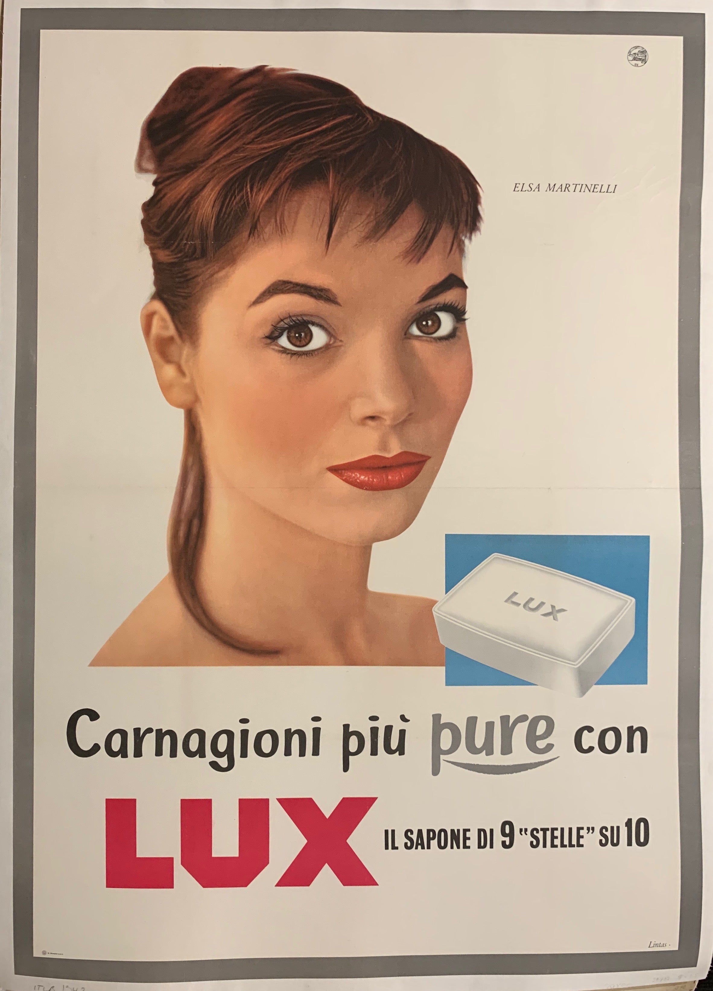 Lux Soap advertisement from Italy. Italian film star Elsa Martinelli promoting Lux soap in this late 1950's beauty campaign. According to the slogan 9 out of 10 stars preferred Lux Soap with lovely looking Martinelli being one of them.