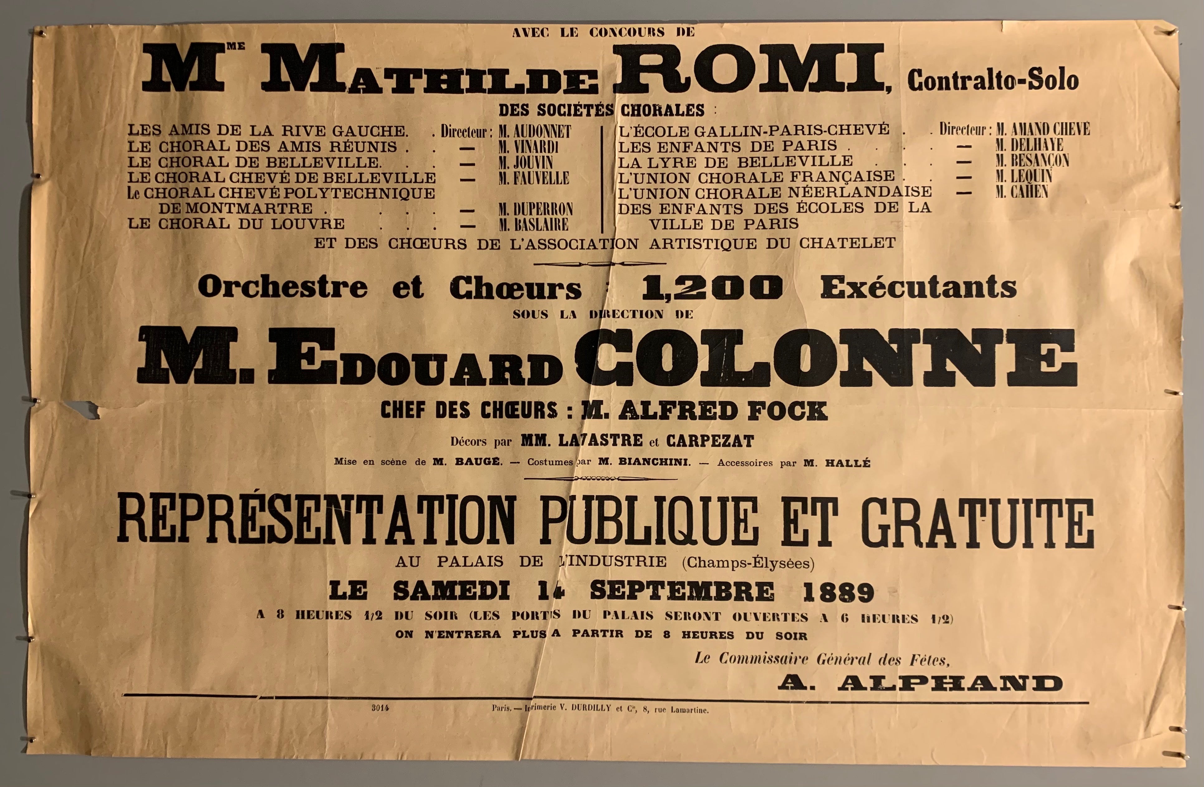 "Avec le concours de Mme Mathilde Romi, Contralto-Solo des Sociétés Chorales... et des choeurs de l'association artistique de Châtelet. Orchestre et Choeurs: 1,200 Exécutants sous la direction de M. Edouard Colonne chef des choeurs: M. Alfred Fock... Représentation Publique et Gratuite au Palais de L'Industrie (Champs-Elysees)" (With the assistance of Mme Mathilde Romi, Contralto-Solo of the Societies Chorales ... and the choirs of the artistic association of Chatelet. Orchestra and Choirs: 1,200 Performers under the direction of Mr. Edouard Colonne choir director: Mr. Alfred Fock ... Public and Free Representation at the Palais de L'Industrie (Champs-Elysees))