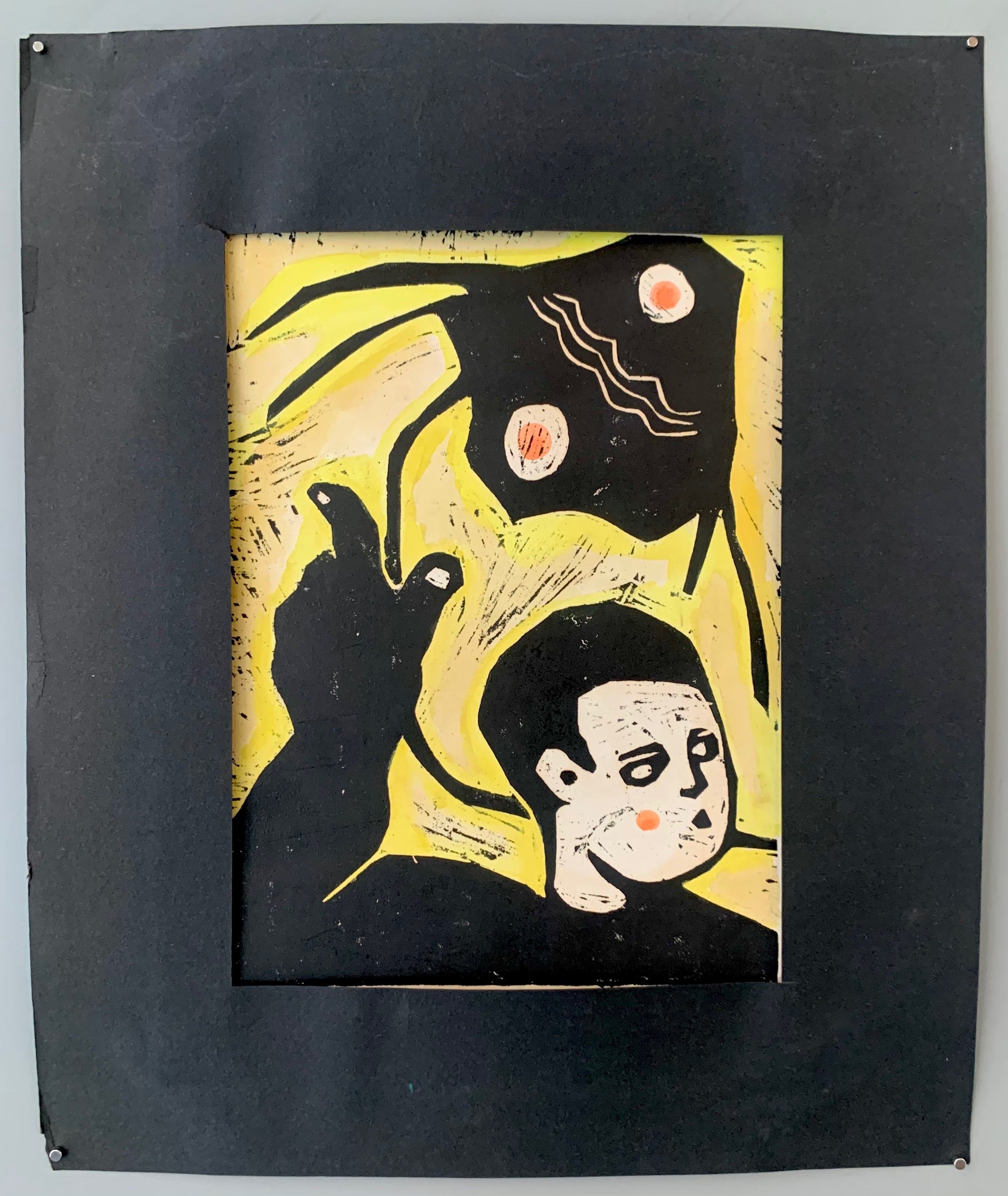 Original woodblock print by Brazilian artist Joaquim Pedro Ribeiro Araujo. The print has a mystical quality to it, the creature above the man's head perhaps a stingray. Joaquim was preoccupied with spiritualism and Buddhism throughout his career, and these themes usually carried over into his artwork. The black border surrounding the print only further draws attention to the engaging figures within.