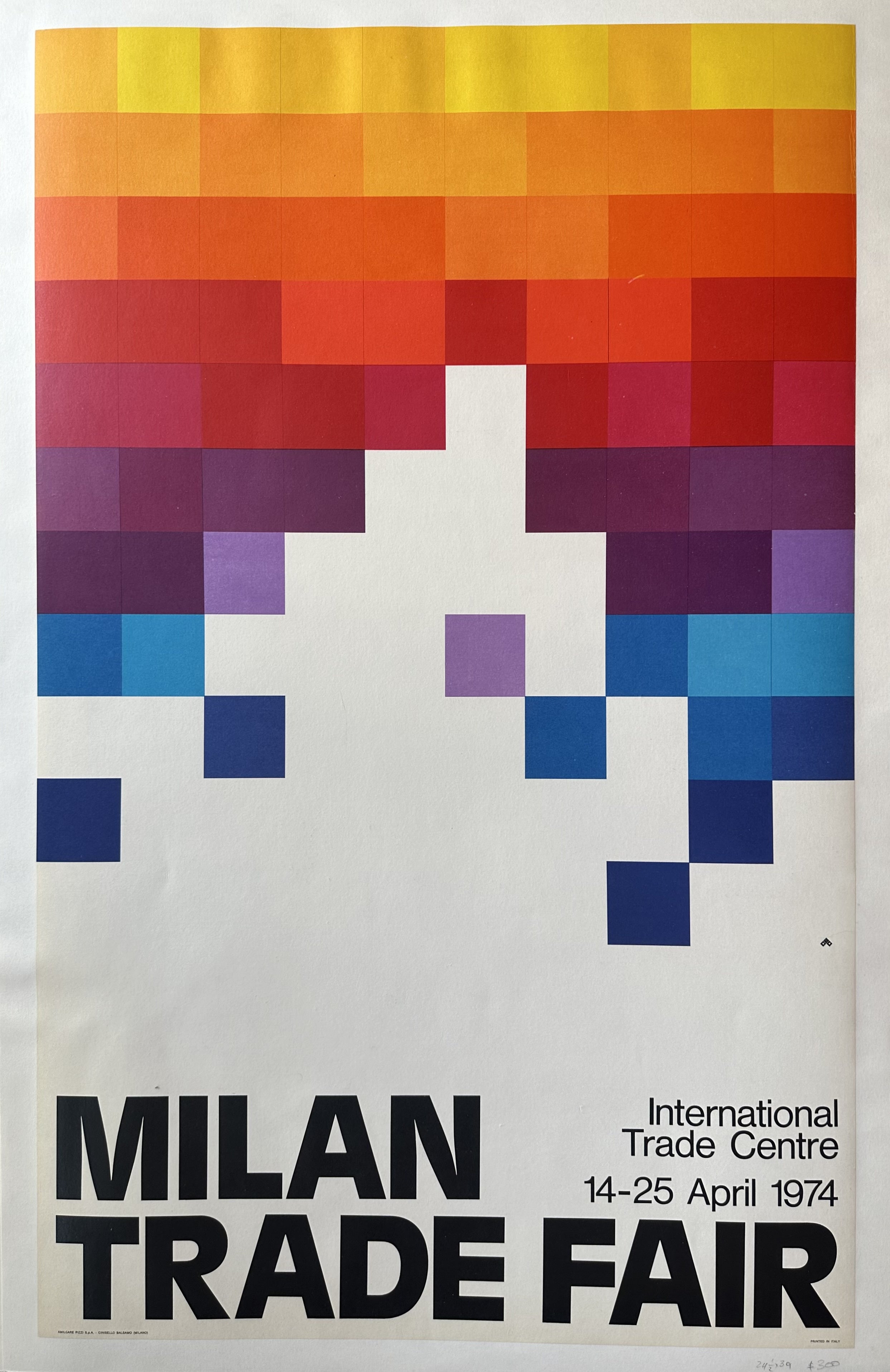 Advertising the annual trade fair in Milan, this poster features colorful pixelated squares cascading towards the text of the poster.