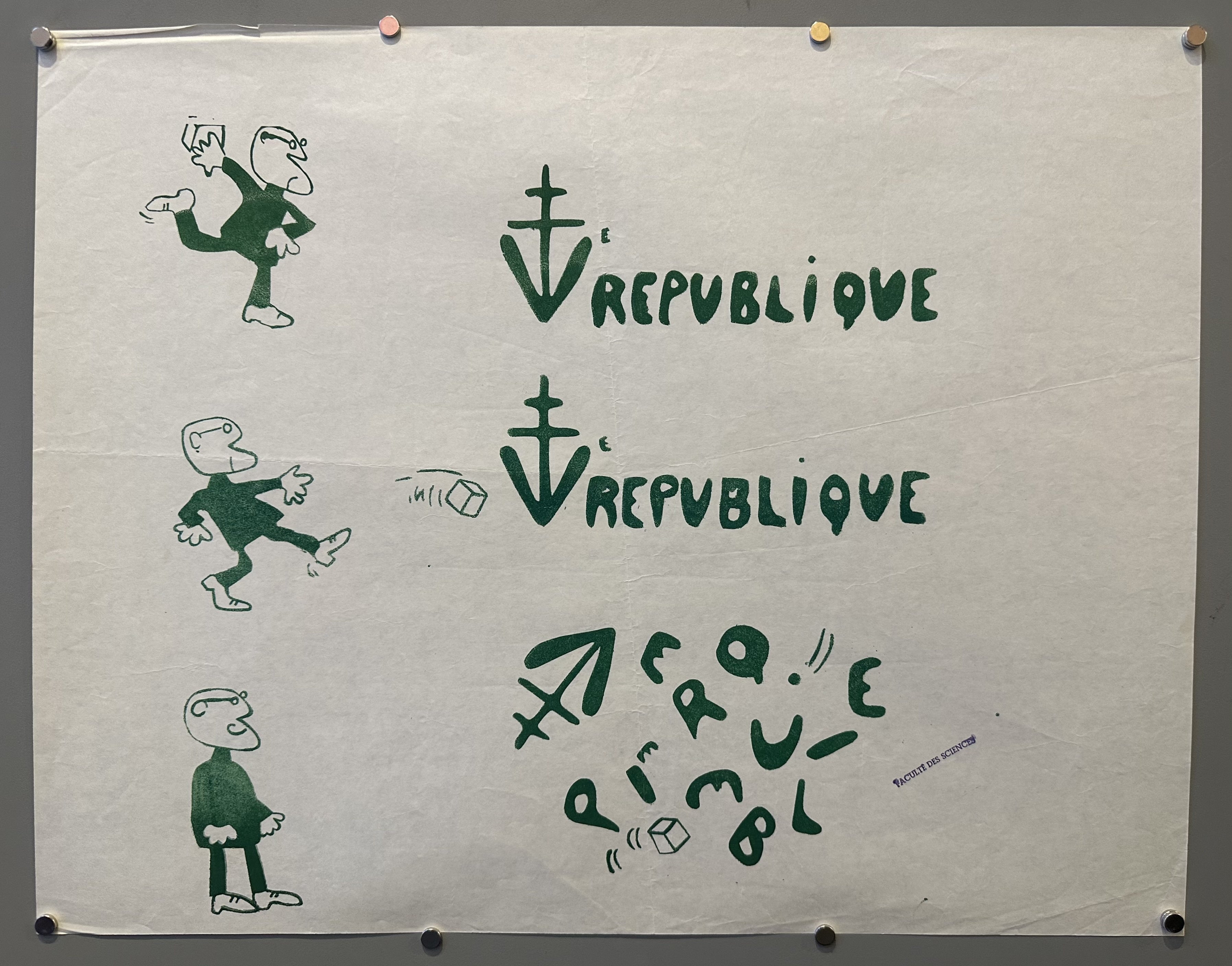 Thrice variegated image of a Frenchman lining up to aim and eventually knocking down the 5th Republique on the third line.