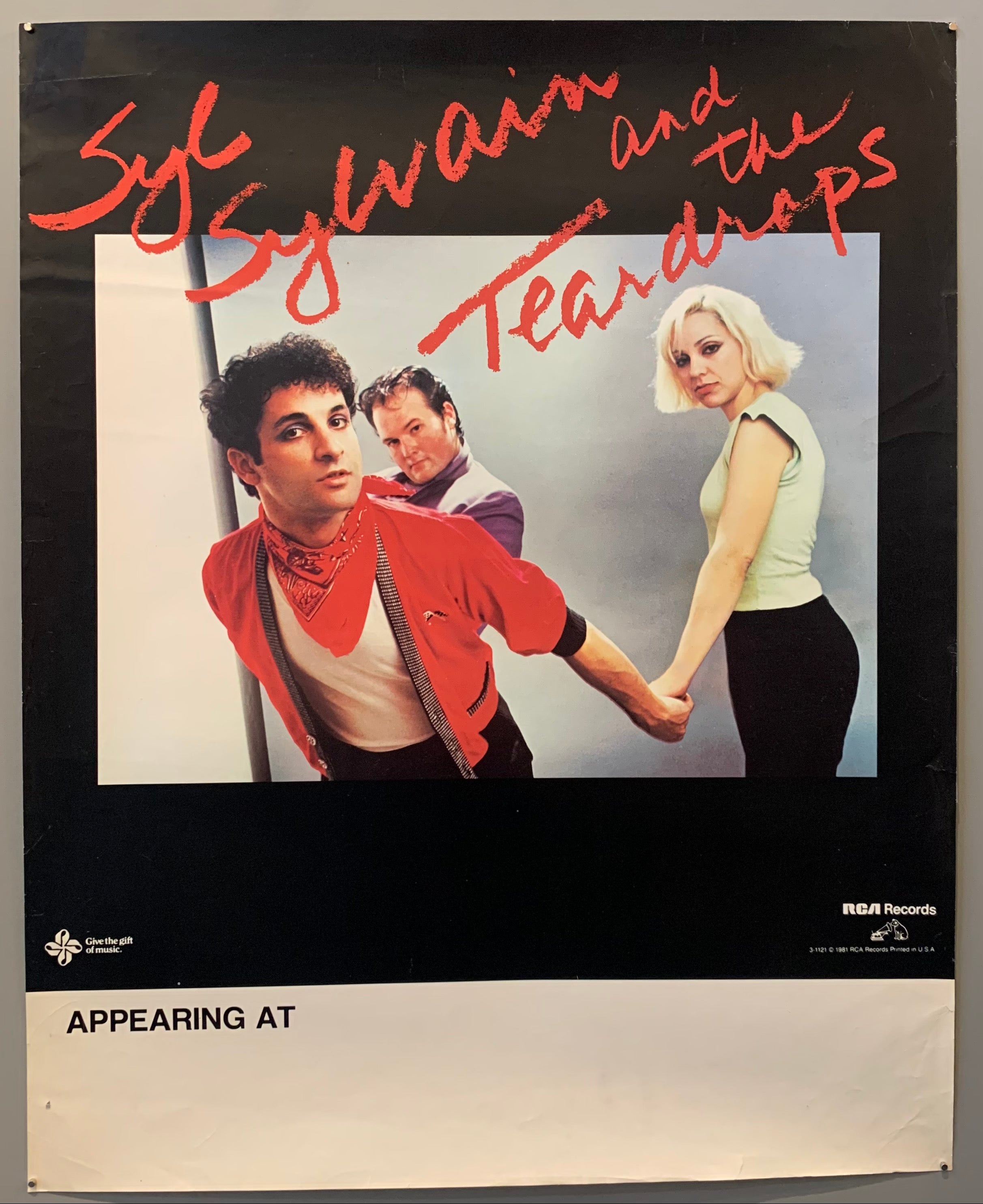 A promotional album release poster for Syl Sylvain who was an American rock guitarist and, prior to a solo career, was a member of the New York Dolls. He released Syl Silvain and the Teardrops (1981) under RCA Records. Poster features the album art and the 'Appearing at:' text space to fill in where Sylvain would be performing next once the poster was hung up.