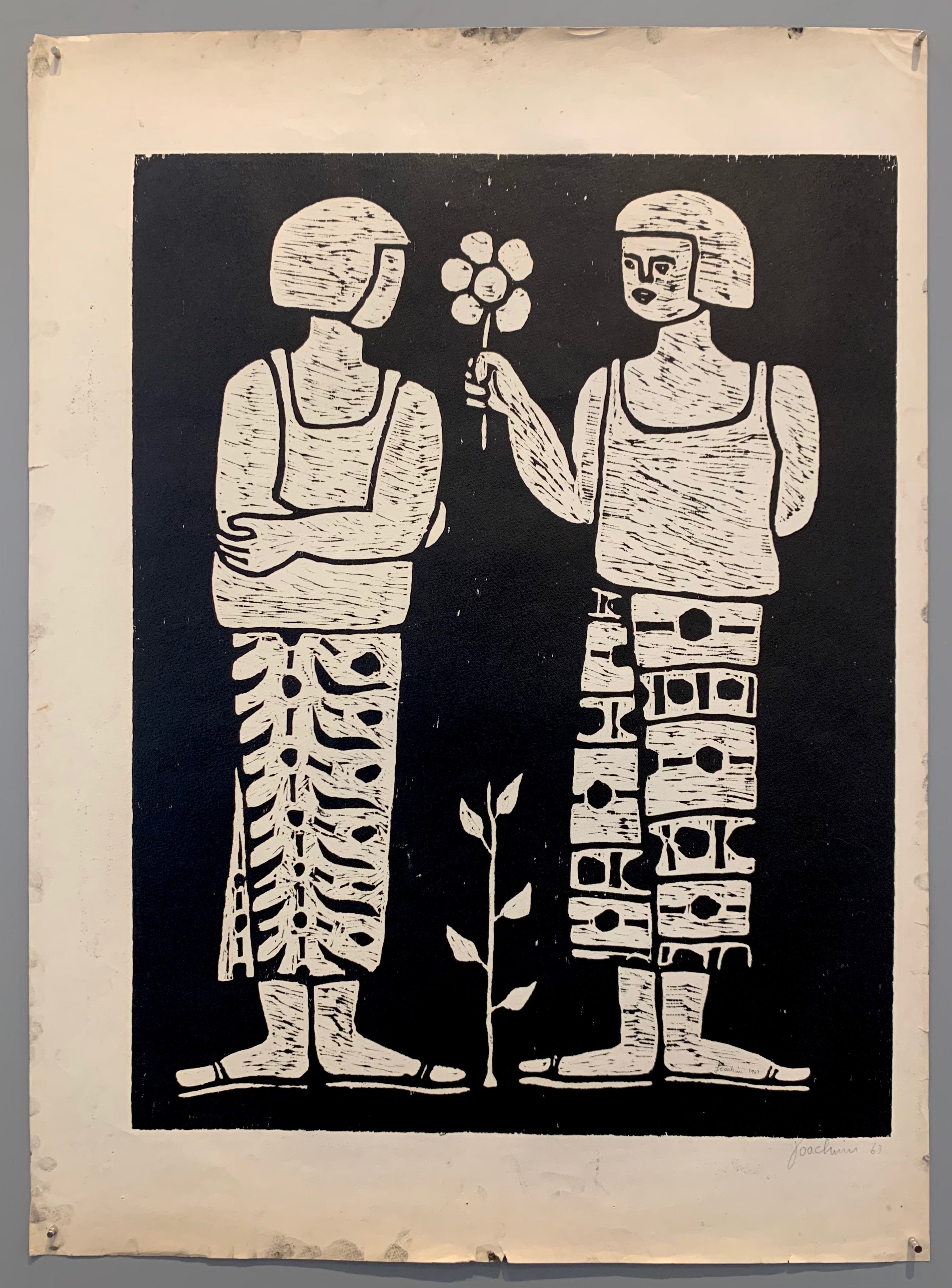 Original woodblock print by Brazilian artist Joaquim Pedro Ribeiro Araujo. Illustrated here are two androgynous figures, one offering a flower to the other. These simple gestures hint at a larger, untold story. The figure receiving the flower has their face turned away. Perhaps the flower is a peace offering after a fight, perhaps something more romantic. Joaquim hand-signed and dated the print in the lower left corner, as well as in the foot of the figure on the left.