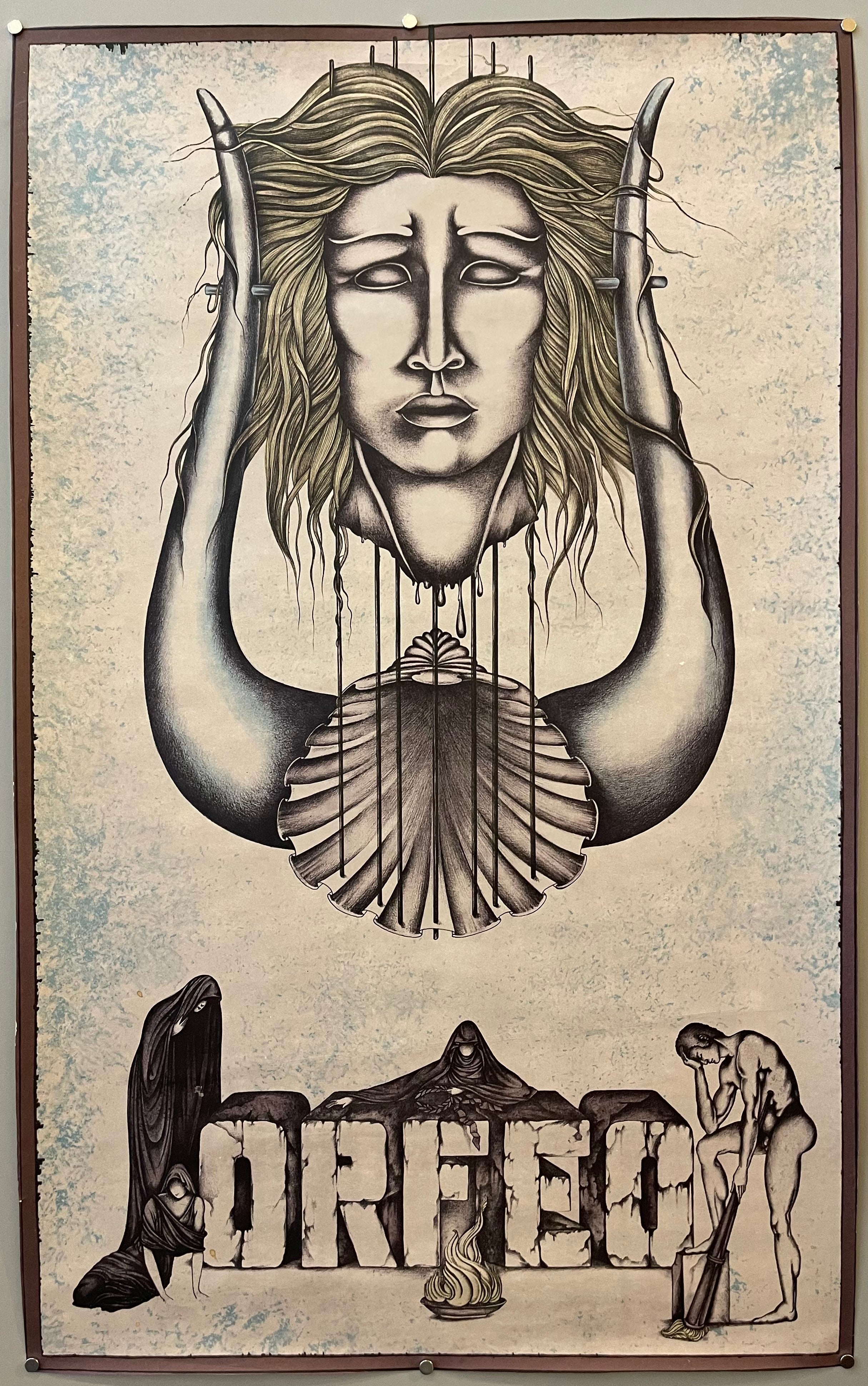 Original vintage poster for a performance in Lodz, Poland of the opera Orpheus. A tale of a lovestruck man who travels to the Underworld to save his Eurydice, the poster illustration perfectly captures the tragic romance of this classic myth.