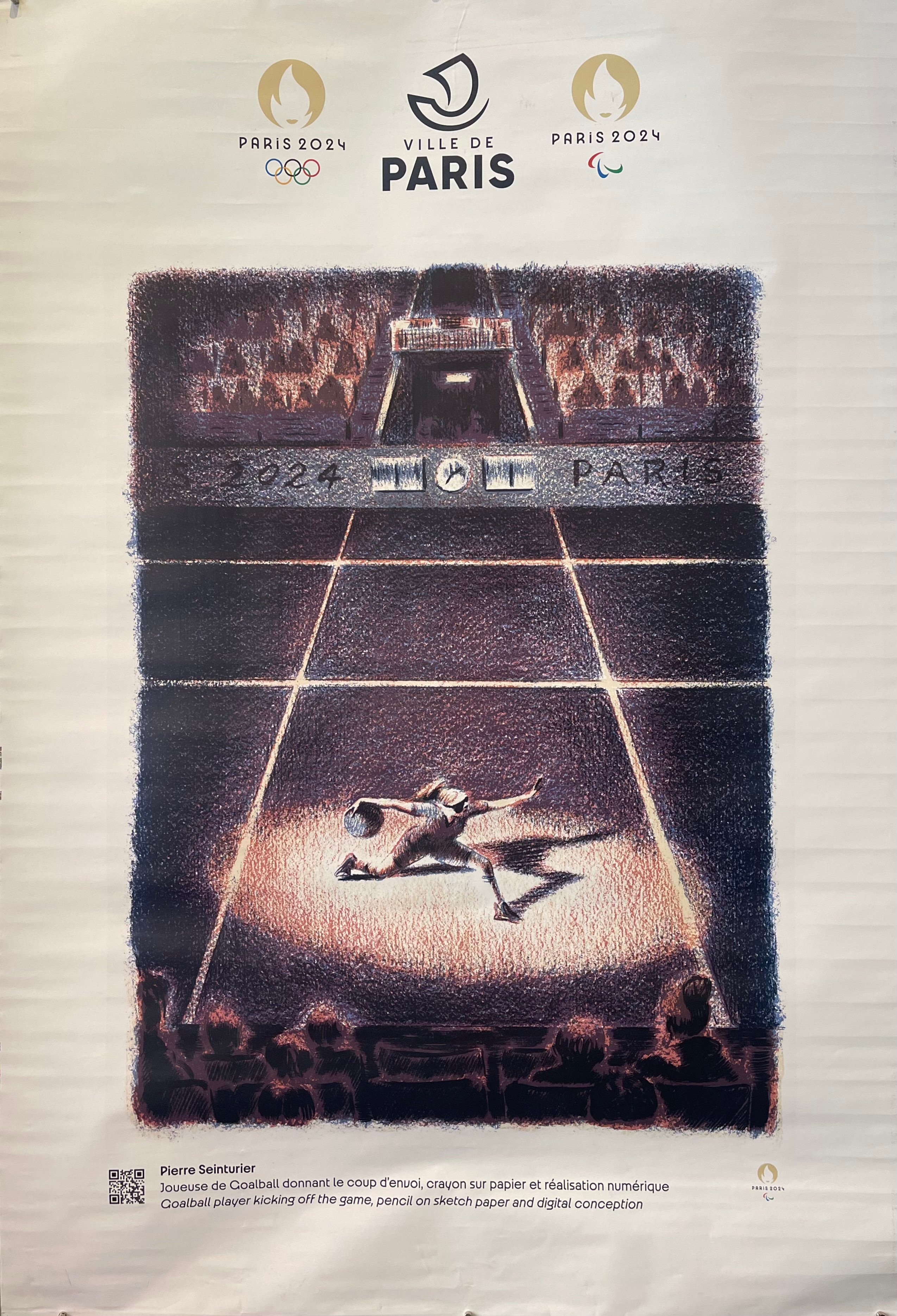 Poster for the Cultural Olympiad, a cultural program for the Paris 2024 Olympics that aims to unite art and sport. This poster features a dramatic pencil illustration of a goalball player kicking off the game, surrounded by a crowd of viewers.