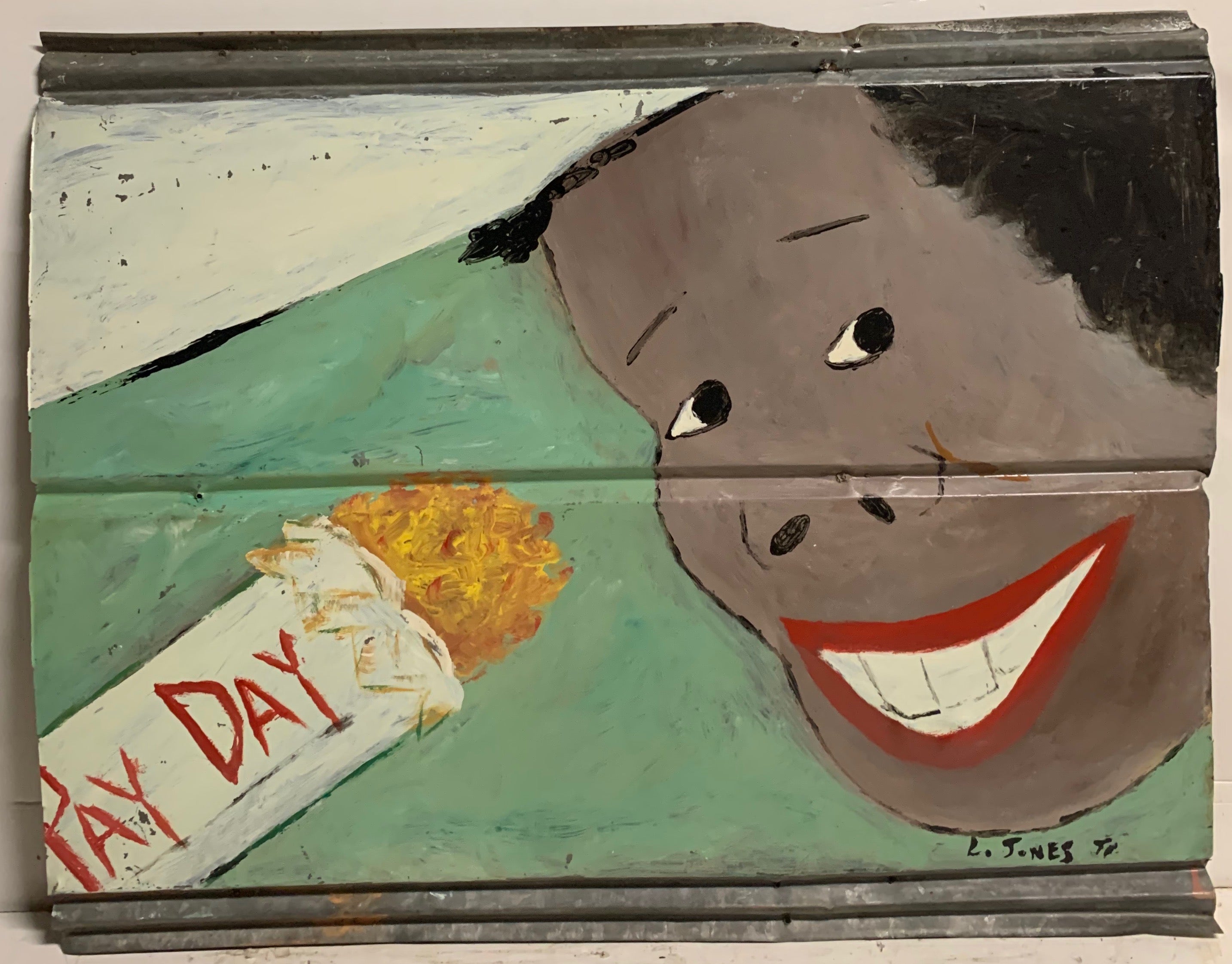 A native Georgian, Leonard Jones taught himself to paint when he was in high school. His works are greatly inspired by scenes from his childhood, images of rural living in the South including housewives, church-goers, and laborers. A folk artist who is often considered outsider, Jones paints to capture candid daily life and the beauty found in the community around him.The use of scrap wood or tin roofing alludes to the buildings he grew up with, and he often incorporates these materials into the paintings themselves. The materials are covered in bold backgrounds of color, which Jones paints subjects over using his fingers or the handles of brushes, leaving a distinctly Leonard Jones work of art.