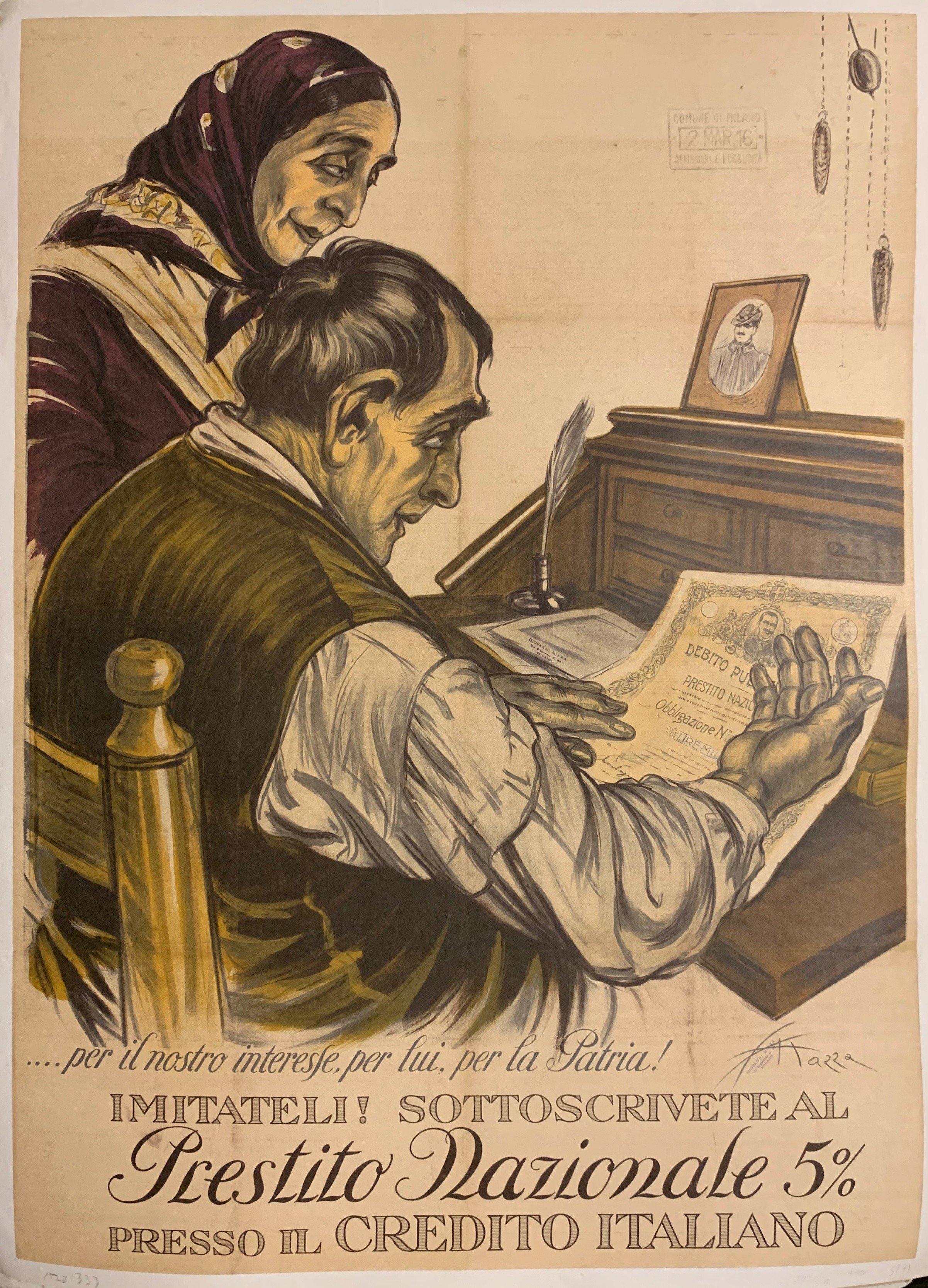 "per i nostri interessi, per la patria, imitali, sottoscrivi il prestito nazionale 5%, prima del credito italiano"