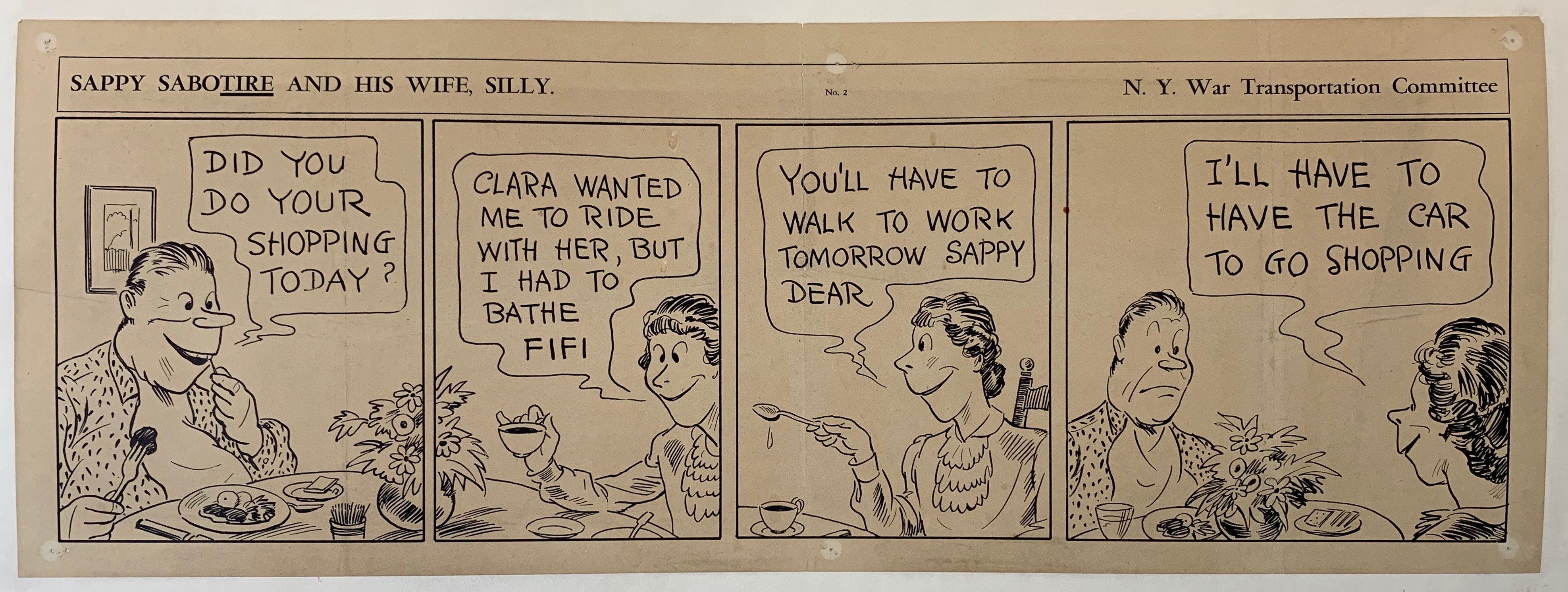 Original vintage comic strip released by the N.Y. War Transportation Committee. The comic illustrates a dinner conversation between a husband and wife, who reveals to the dismay of her husband that he will have to be walking to work tomorrow. Presumably comics like these were created to poke some light hearted fun at the need to conserve energy and oil during the World War II war effort.