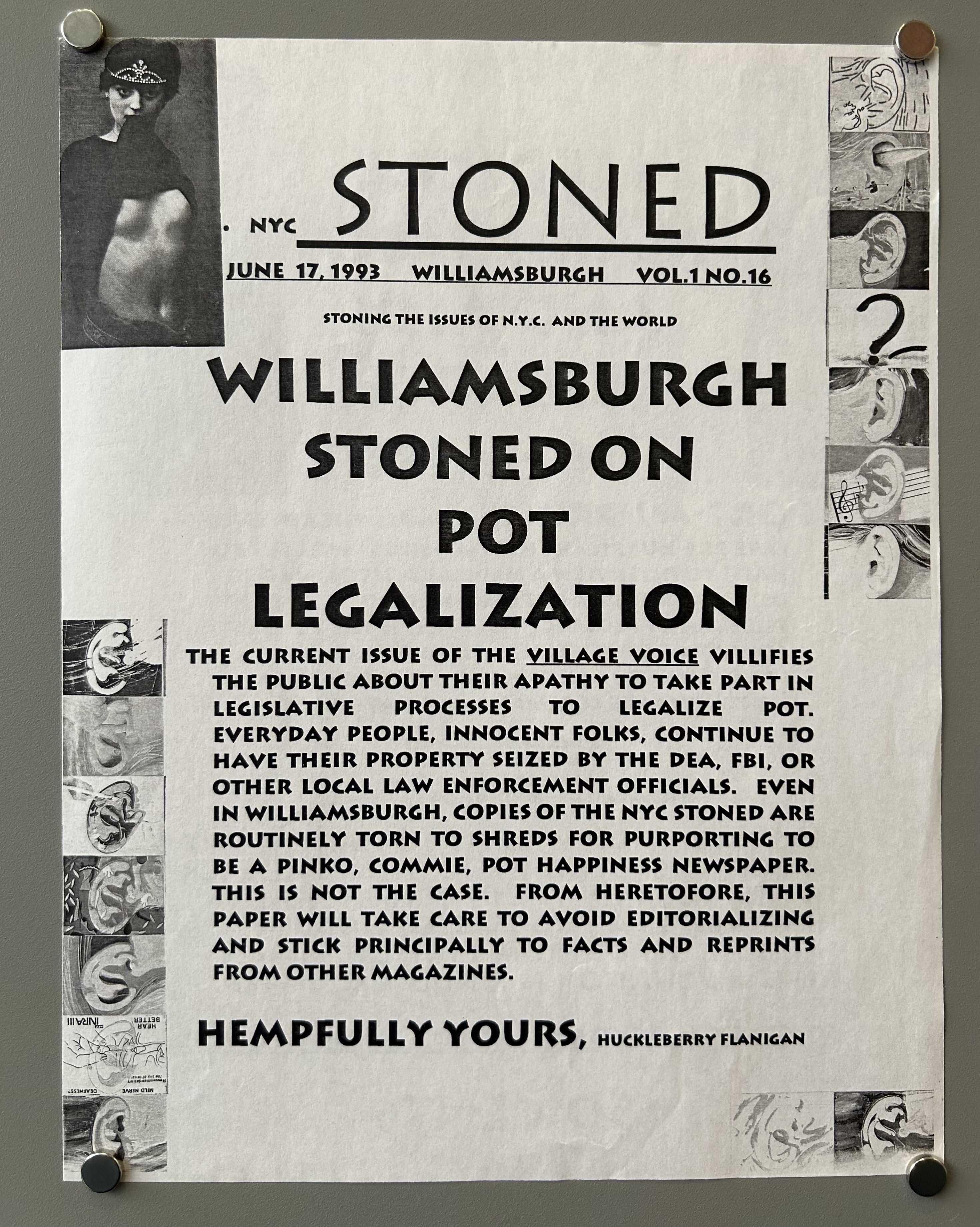 Front: "Williamsburgh Stoned on Pot Legislation: The current issue of the Village Voice vilified the public about their apathy to take part in legislative processes to legalize pot. Everyday people, innocent folks continue to have their property seized by the DEA, FBI, or other local law enforcement officials. Even in Williamsburg, copies of the NYC Stoned are routinely torn to shreds for purporting to be a Pinko, Commie, Pot Happiness newspaper. This is not the case. From heretofore, this paper will take care to avoid editorializing and stick principally to facts and reprints from other magazines. Hempfully yours, Huckleberry Flanigan."