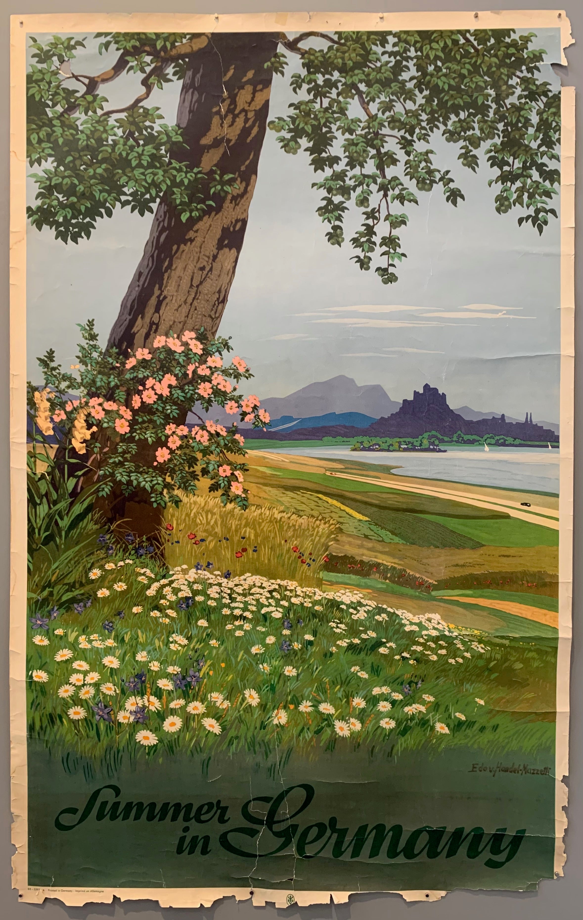 Beautiful german poster depicting a summer scene with a tree in the foreground and many blooming flowers. Mountains and a body of water pictured in the background. printed in Germany.