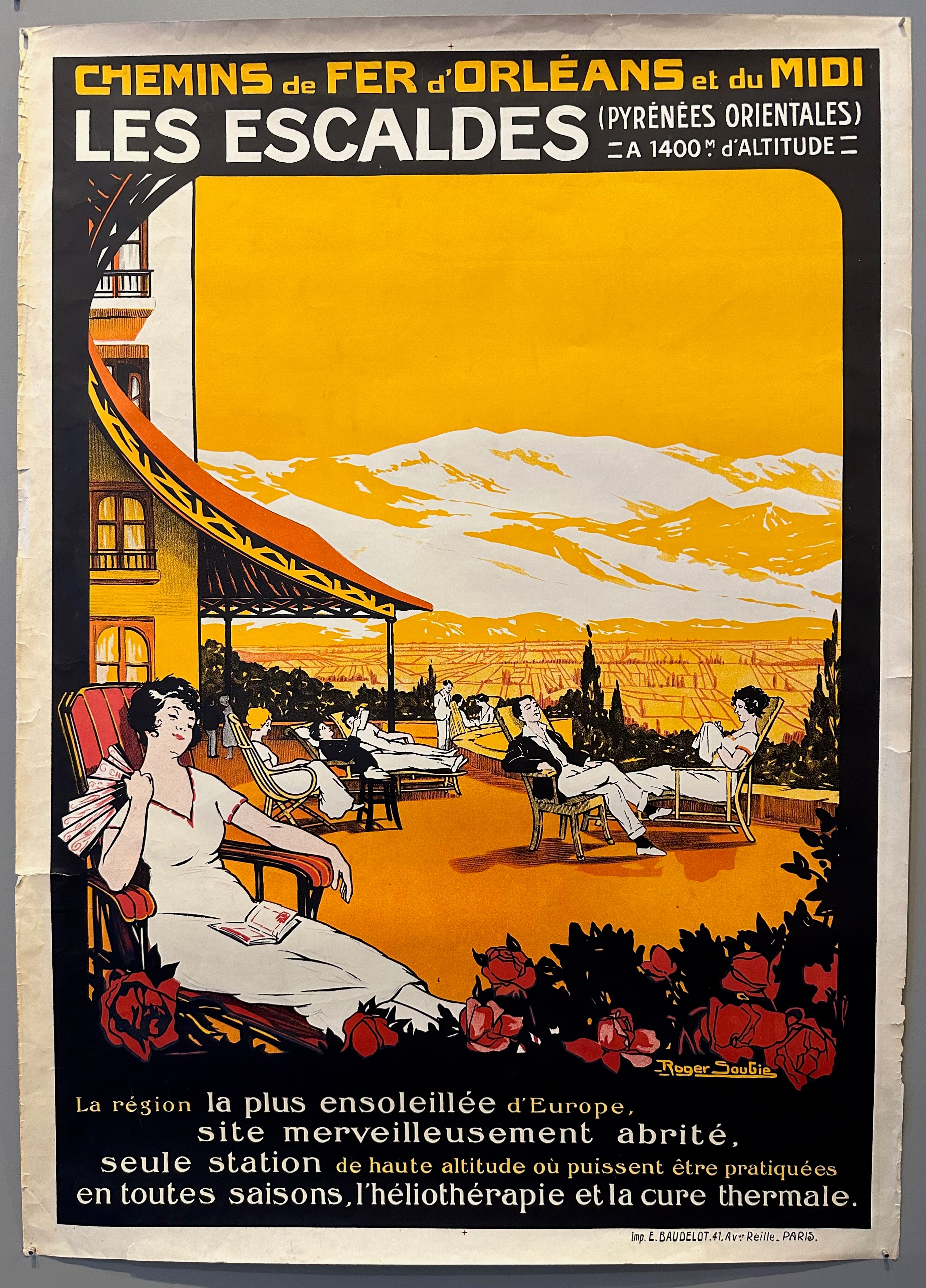 English translation: "Orleans and midi railways. Les Escaldes (Pyrenees Orientales) at 1400 m. altitude. / The sunniest region in Europe, a wonderfully sheltered site, the only high-altitude resort where heliotherapy and spa treatments can be practiced in all seasons."