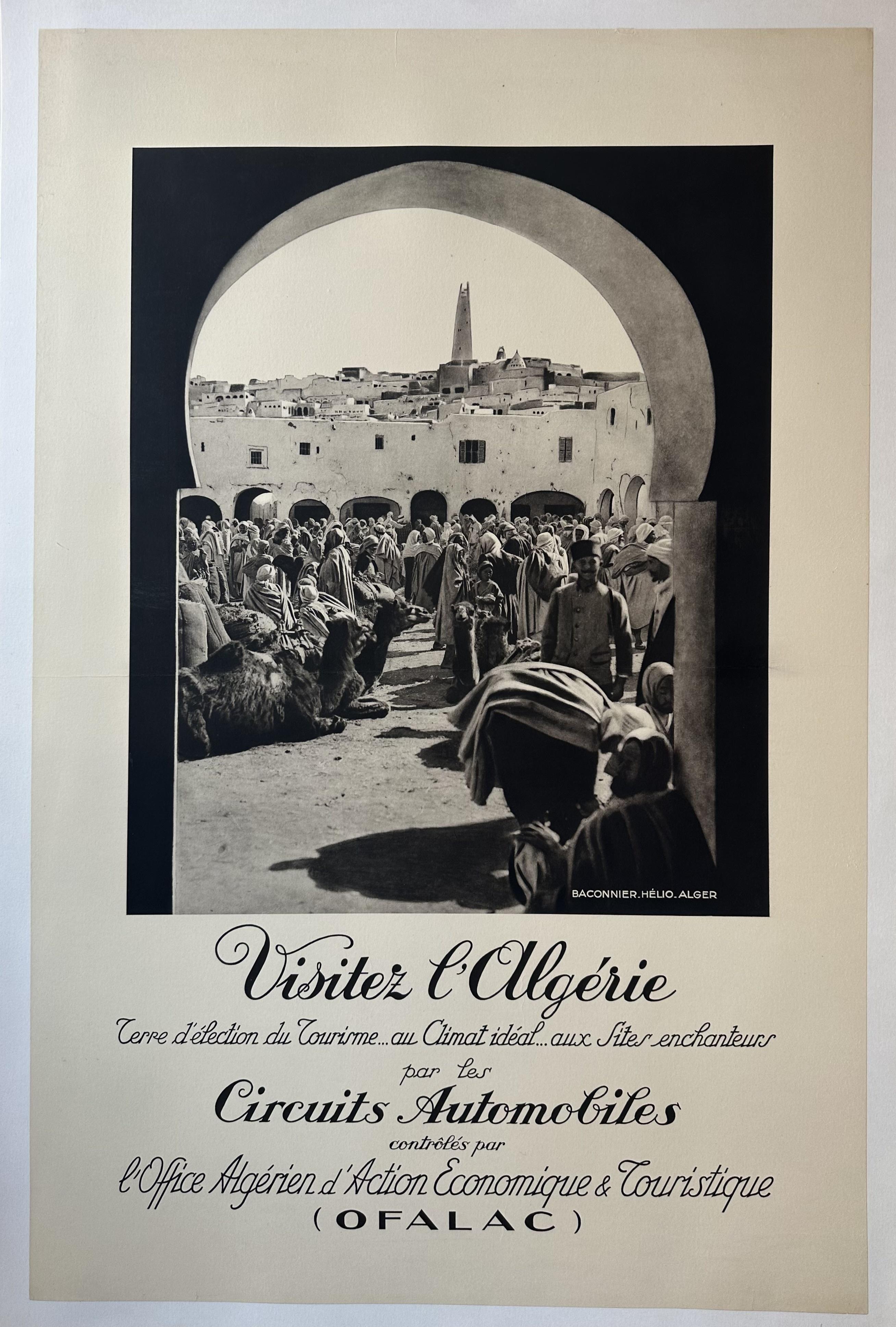 Travel poster promoting tourism in Algeria. A black and white photograph shows herds of people and camels, promising similar exciting views if one were to visit Algeria.