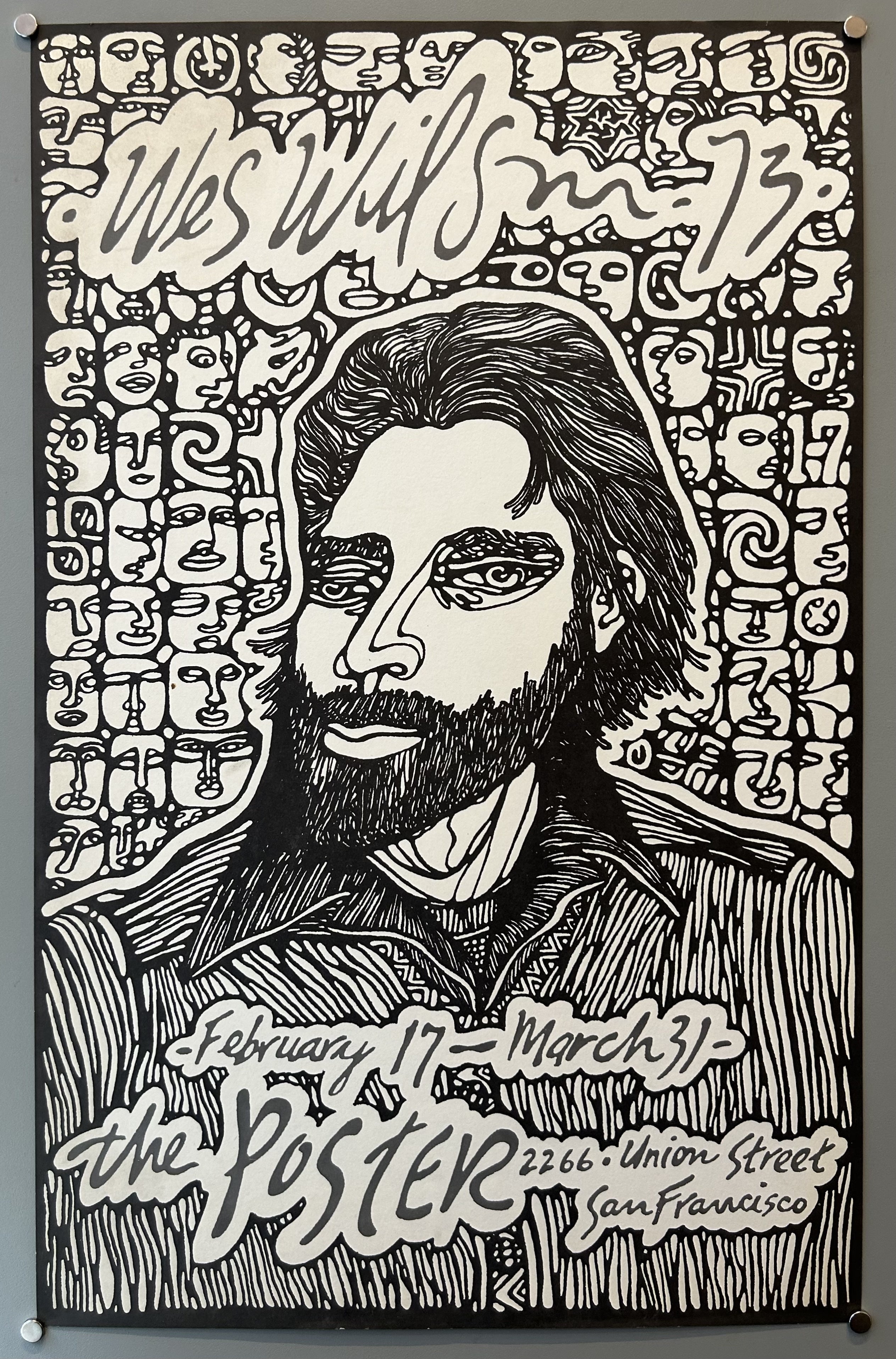 Promoting an exhibit of works by Wes Wilson in San Francisco. Wilson was an American artist best known for designing posters for Bill Graham of The Fillmore in San Francisco, his style exemplifies the peace movement, the psychedelic era and the 1960s.
